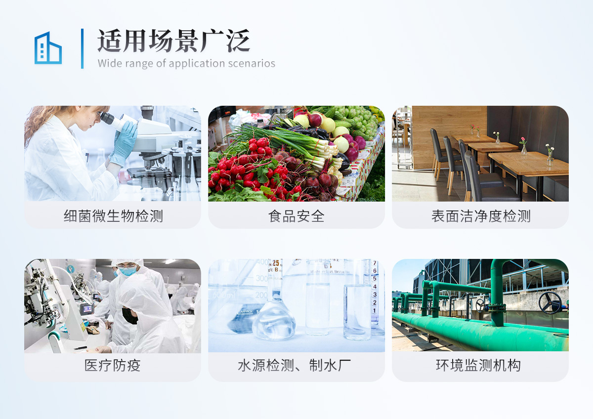 | 1. 食品:肉類、果蔬、奶制品、主食、調(diào)味料、飲料、半處理類食品以及飲料等,農(nóng)產(chǎn)品及相關(guān)加工公司; | 2.水質(zhì):生活飲用水、自然界水源、制水廠; | 3. 表面:潔凈臺、餐具/ 器具表面; | 4. 其他:藥品、化妝品等; | 5. HACCP( 危害分析和關(guān)鍵控制點) 診斷,以及適用于災(zāi)難現(xiàn)場、臨場、抽檢、大型會議等微生物安全快速檢測。 |