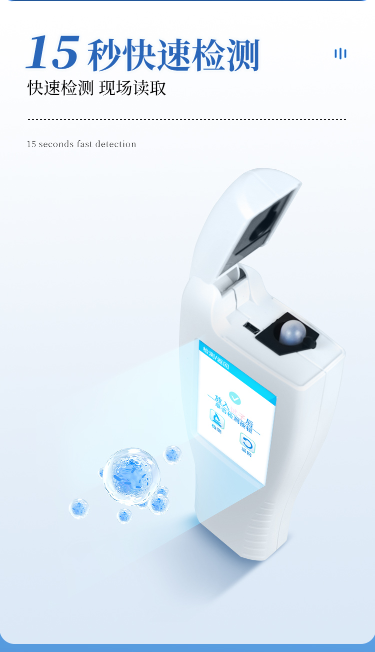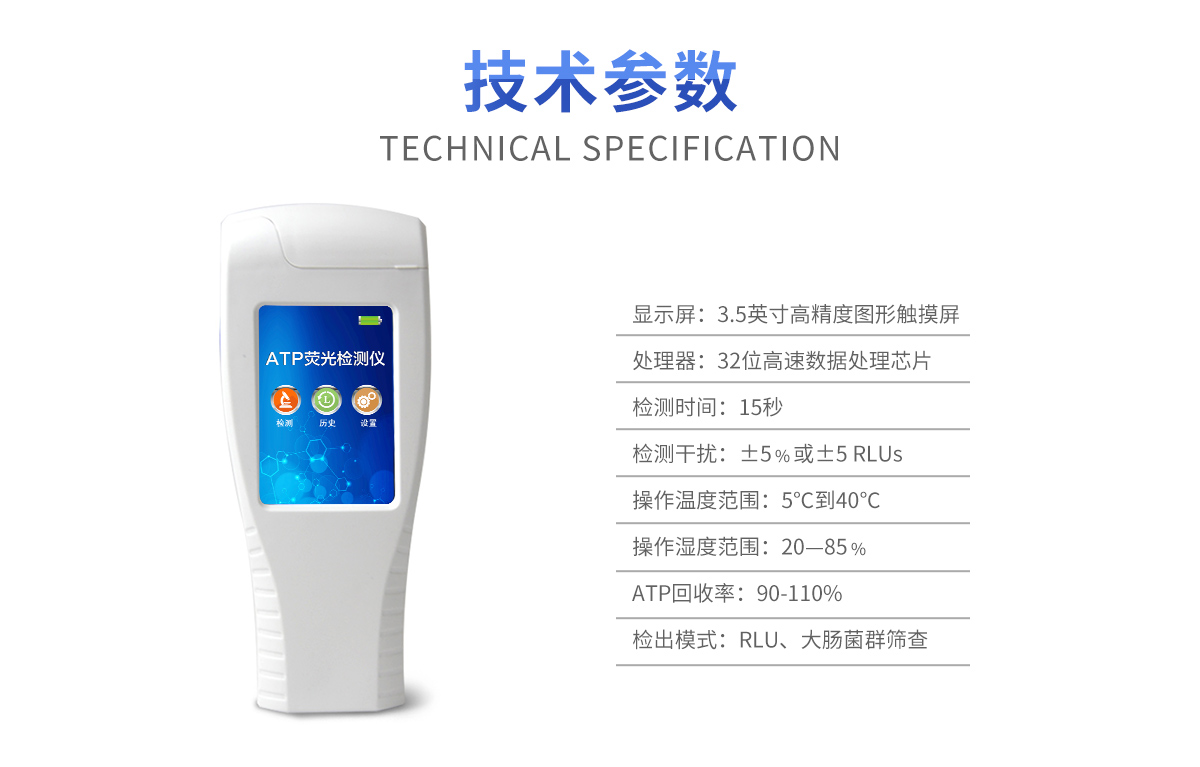 該設備為全新升級產品,安卓智能操作系統。操作采用生物化學反應方法檢測ATP含量,ATP熒光檢測儀基于螢火蟲發光原理,利用“熒光素酶—熒光素體系”快速檢測三磷酸腺苷(ATP)。ATP拭子含有可以裂解細胞膜的試劑,能將細胞內ATP釋放出來,與試劑中含有的特異性酶發生反應,產生光,再用熒光照度計檢測發光值,微生物的數量與發光值成正比,由于所有生物活細胞中含有恒量的ATP,所以ATP含量可以清晰地表明樣品中微生物與其他生物殘余的多少,用于判斷衛生狀況。