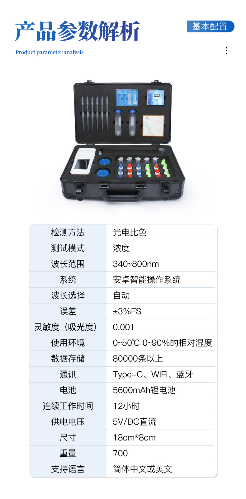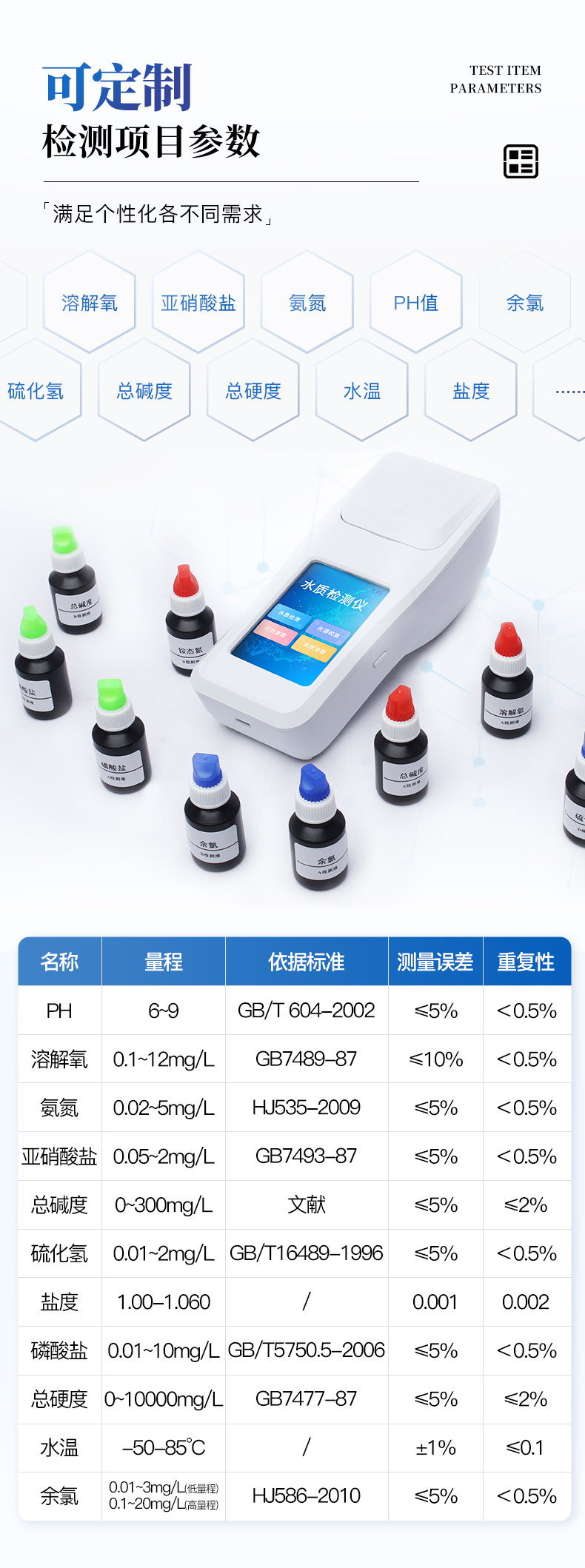 檢測項目:可檢測PH、溶解氧、氨氮、亞硝酸鹽、總堿度、硫化氫、鹽度、磷酸鹽、總硬度9項指標