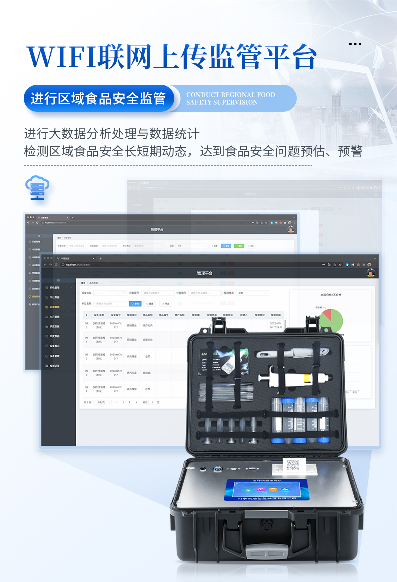 13、支持Wifi網絡,數據可局域網和互聯網數據上傳,檢測結果直接傳至食品安全監管平臺。進行區域食品安全監管及大數據分析處理,檢測區域食品安全長短期動態,達到食品安全問題預估、預警