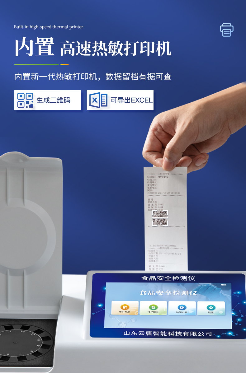 8.3、數(shù)據(jù)監(jiān)管系統(tǒng):同步對(duì)接監(jiān)管平臺(tái),數(shù)據(jù)可局域網(wǎng)和互聯(lián)網(wǎng)數(shù)據(jù)上傳,檢測(cè)結(jié)果可選擇直接傳至食品安全監(jiān)管平臺(tái)。進(jìn)行區(qū)域食品安全監(jiān)管及大數(shù)據(jù)分析處理與數(shù)據(jù)統(tǒng)計(jì),檢測(cè)區(qū)域食品安全長(zhǎng)短期動(dòng)態(tài),達(dá)到食品安全問(wèn)題預(yù)估、預(yù)警。8.4、打印系統(tǒng):內(nèi)置全新打印機(jī),可以打印:項(xiàng)目名稱,二維碼,抽樣信息、檢測(cè)信息,受檢信息、復(fù)核信息、抽樣日期、檢測(cè)日期等信息的打印。