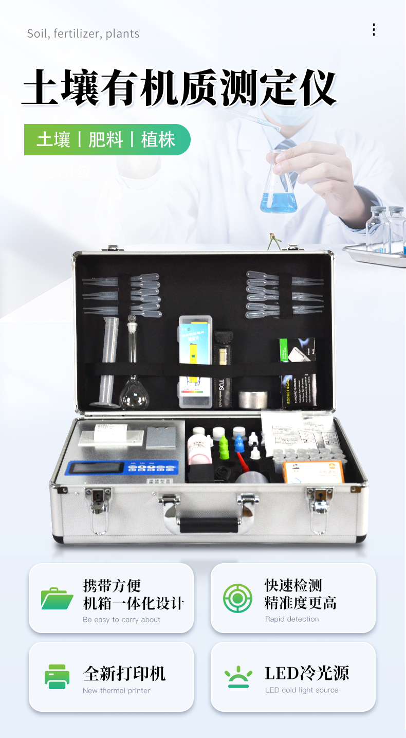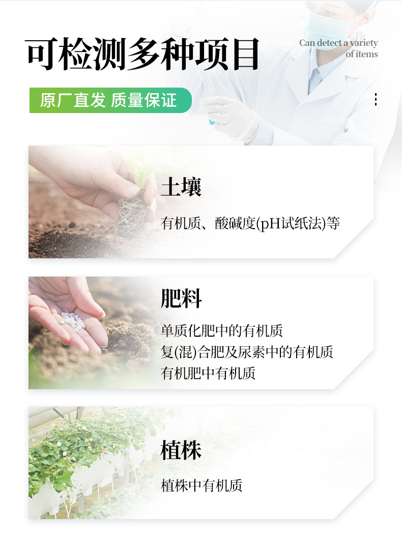 4、可檢測土壤及化肥、有機肥、植株中的速效氮、有效磷、速效鉀、全氮、全磷、全鉀、有機質含量,土壤酸堿度,含鹽量(擴展)。