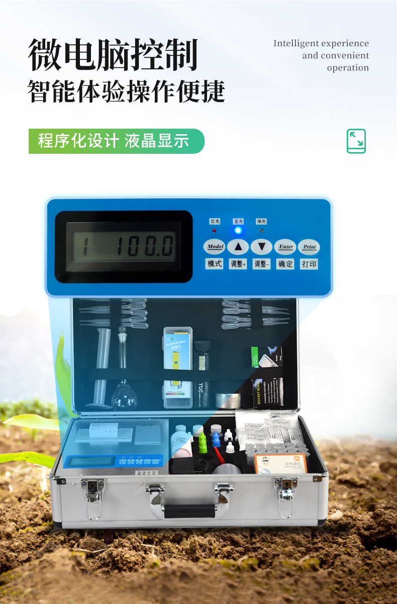 配套齊全:土壤養分速測儀該儀器集藥、器、儀為一體,攜帶方便,相當于一個小型實驗室。適于農業服務部門或農資經銷商、肥料廠商測土施肥和鑒別肥料真假。