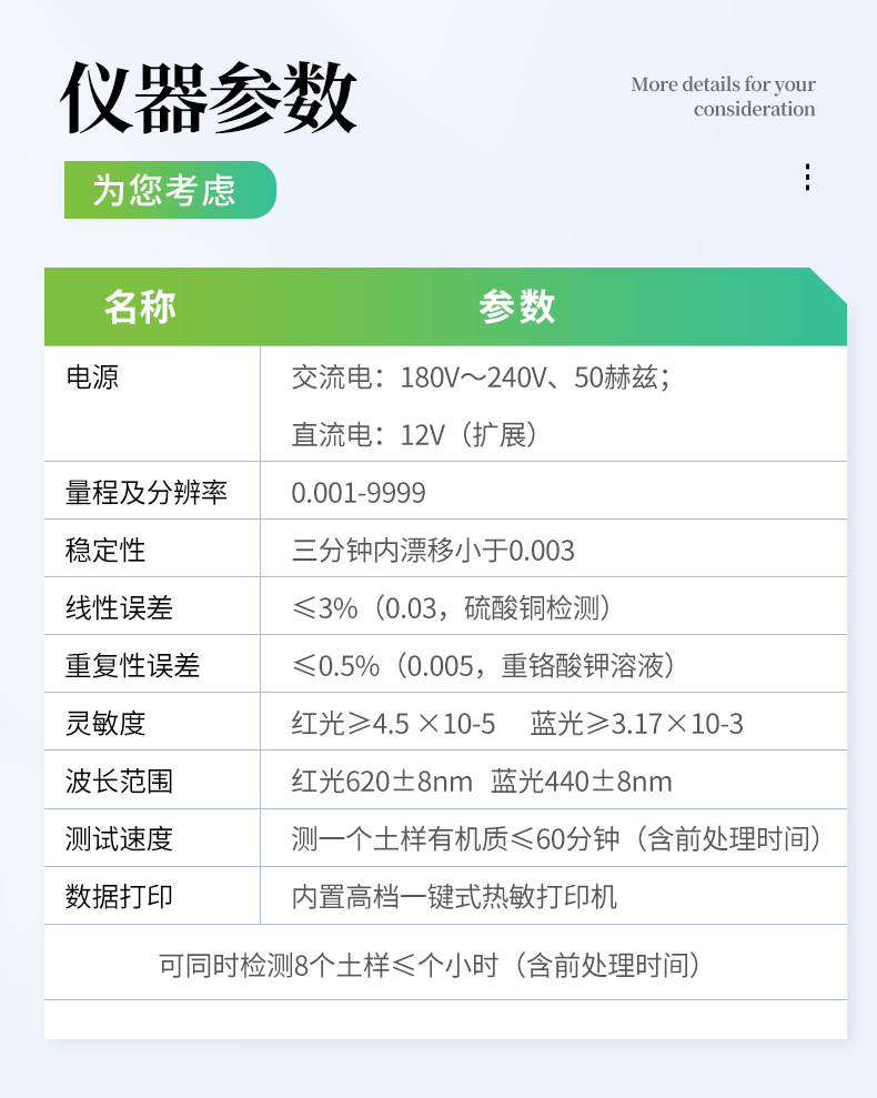 測一個土樣(N、P、K)≤30分鐘,同時檢測三個土樣(N、P、K)≤40分鐘。