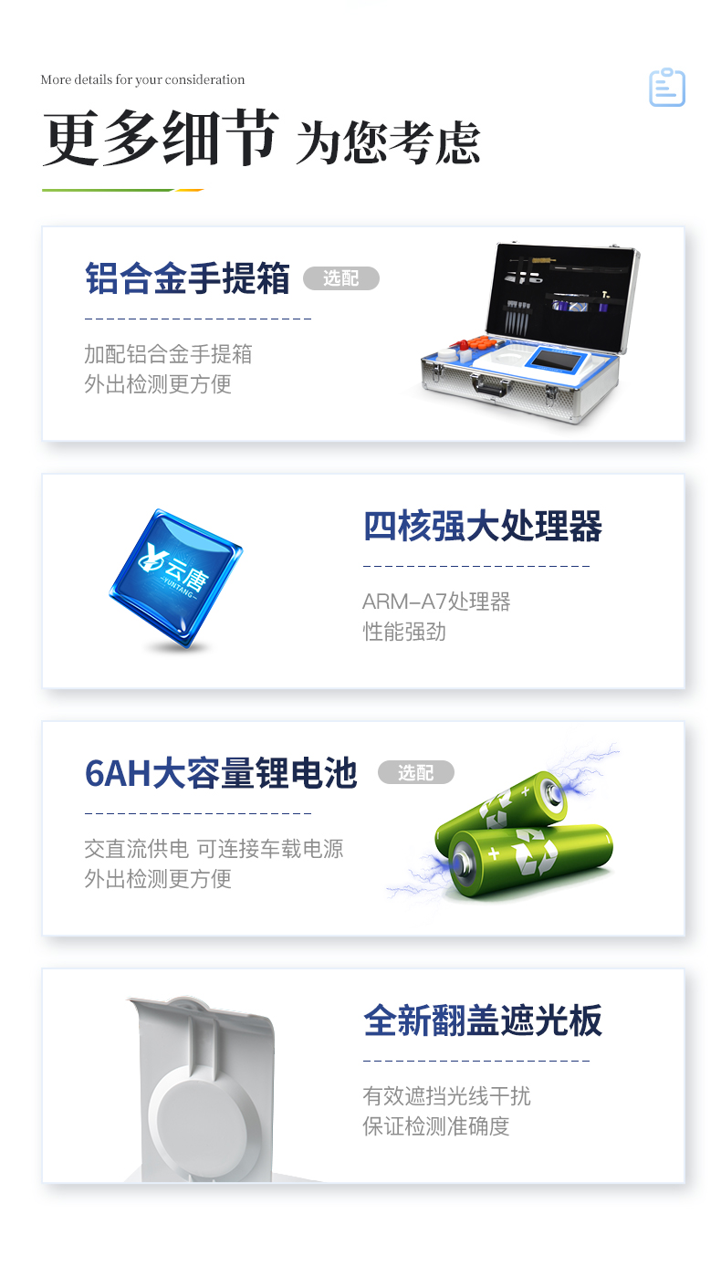 | 1、儀器采用臺(tái)式一體化系統(tǒng)檢測(cè)技術(shù),將分光光度模塊、數(shù)字化管理模塊、無(wú)線通訊模塊高度集成于一體,支持檢測(cè)幾十種食品安全檢測(cè)項(xiàng)目,同時(shí)預(yù)留升級(jí)檢測(cè)方法。 | 2、儀器檢測(cè)模塊標(biāo)準(zhǔn)化、智能化,檢測(cè)項(xiàng)目可隨意自由組合。檢測(cè)箱體內(nèi)置多個(gè)標(biāo)準(zhǔn)檢測(cè)單元,檢測(cè)模塊可以調(diào)整配置。 | 3、顯示屏幕:儀器采用7英寸液晶觸摸屏,搭配運(yùn)行安卓智能操作系統(tǒng),主控芯片采用ARM Cortex-A7,RK3288/4核處理器,主頻1.88Ghz,操作方便,性能更強(qiáng)。 | 4、檢測(cè)通道:≥12通道;采用精密旋轉(zhuǎn)比色池設(shè)計(jì),使用同芯片同光源校準(zhǔn)精度,解決不同光源之間的誤差值,更加準(zhǔn)確**。 | 5、儀器光源:高精度進(jìn)口四波長(zhǎng)冷光源,每個(gè)通道均配置 410、520、590、630nm 波長(zhǎng)光源,標(biāo)配**的光路切換裝置,專利光路切換功能可實(shí)現(xiàn)64波長(zhǎng),并且所有檢測(cè)項(xiàng)目可實(shí)現(xiàn)所有通道同時(shí)檢測(cè)。 | 6、通訊接口:配備無(wú)線通信模塊、可選配4G(APN)通訊模塊和藍(lán)牙傳輸,同時(shí)具有USB接口,可以多方式實(shí)現(xiàn)數(shù)據(jù)保存及數(shù)據(jù)傳輸。 | 7、存儲(chǔ)方式:支持U盤存儲(chǔ),標(biāo)準(zhǔn)USB接口,免驅(qū)動(dòng)安裝。檢測(cè)結(jié)果存儲(chǔ)容量20萬(wàn)條以上,可生成Excel表格進(jìn)行拷貝,并具有登錄保護(hù)功能。 | 8、智能化操作系統(tǒng): | 8.1、操作系統(tǒng):儀器可在同一檢測(cè)界面自動(dòng)對(duì)應(yīng)相關(guān)檢測(cè)通道,一次性選擇1-12個(gè)樣品名稱,無(wú)需退出界面,節(jié)省操作時(shí)間。并可以對(duì)每個(gè)通道屬性和樣品信息單獨(dú)進(jìn)行編輯,例如送檢單位、人員,檢測(cè)人員等,打印時(shí)勾選打印顯示。 | 8.2、限量規(guī)判系統(tǒng):具有限量查詢、添加物質(zhì)合規(guī)判定系統(tǒng)。檢測(cè)出結(jié)果后,系統(tǒng)自動(dòng)調(diào)用系統(tǒng)數(shù)據(jù)庫(kù)中相關(guān)國(guó)標(biāo)進(jìn)行比對(duì)判定,客觀顯示結(jié)果是否合格。 | 8.3、數(shù)據(jù)監(jiān)管系統(tǒng):同步對(duì)接監(jiān)管平臺(tái),數(shù)據(jù)可局域網(wǎng)和互聯(lián)網(wǎng)數(shù)據(jù)上傳,檢測(cè)結(jié)果可選擇直接傳至食品安全監(jiān)管平臺(tái)。進(jìn)行區(qū)域食品安全監(jiān)管及大數(shù)據(jù)分析處理與數(shù)據(jù)統(tǒng)計(jì),檢測(cè)區(qū)域食品安全長(zhǎng)短期動(dòng)態(tài),達(dá)到食品安全問(wèn)題預(yù)估、預(yù)警。 | 8.4、打印系統(tǒng):內(nèi)置全新打印機(jī),可以打印:項(xiàng)目名稱,二維碼,抽樣信息、檢測(cè)信息,受檢信息、復(fù)核信息、抽樣日期、檢測(cè)日期等信息的打印。 | 9、供電模式:儀器交直流兩用,直流12V供電(標(biāo)配),可連接車載電源,亦可選配6ah大容量充電鋰電池,電量可實(shí)時(shí)顯示,方便戶外流動(dòng)測(cè)試。 | 10、儀器具有重新校準(zhǔn)、鎖定、恢復(fù)出廠設(shè)置功能, | 11、外觀尺寸:415X310X150(mm) ,并可加配鋁合金手提箱 |
