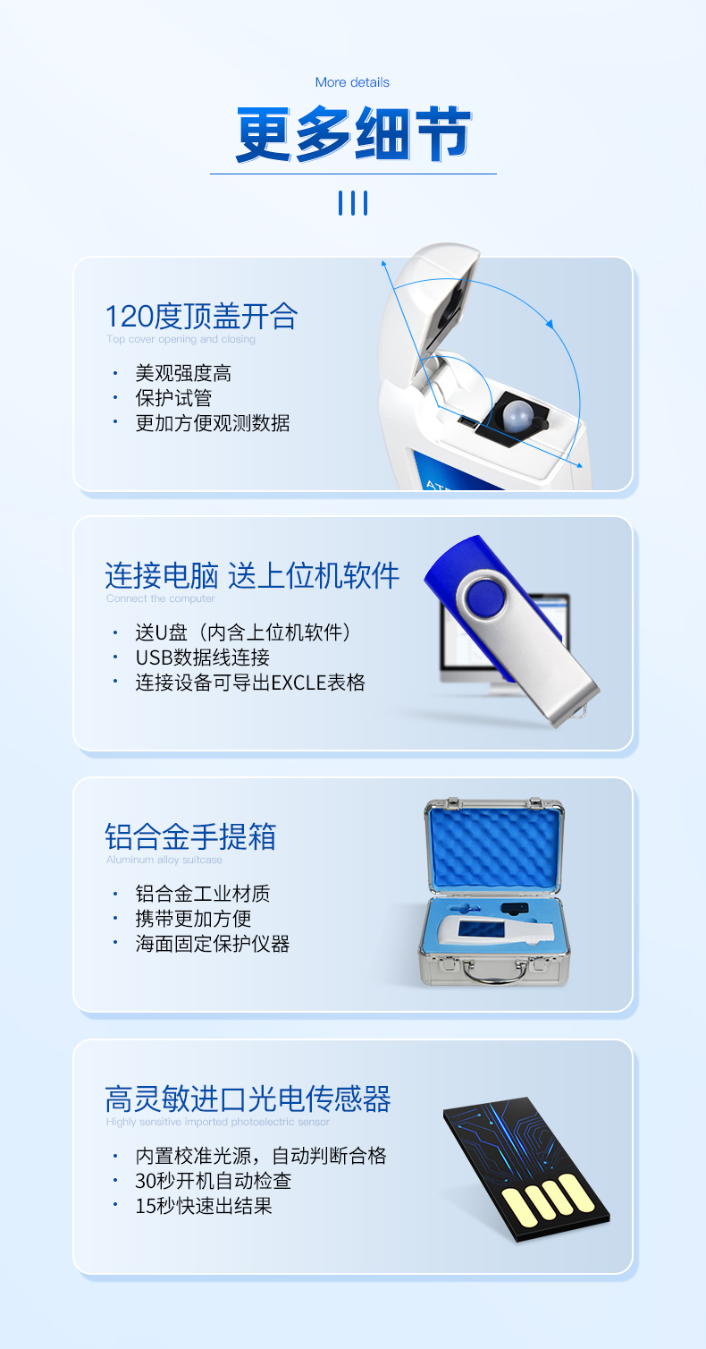 隨機配置:ATP熒光檢測儀(手持)主機、鋁合金手提箱、驅動U盤、儀器包、掛繩、PC數據線、數據分析軟件、中文操作手冊