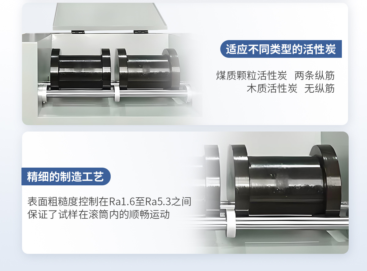 活性炭強度測定儀儀按照規(guī)定的試驗條件,將活性炭試料置于裝有鋼球的滾筒中,開啟強度測定儀,開始計時,通過滾筒的機械運動,試料被磨損,測定被破壞試料粒度的變化情況,用保留在試驗篩上的試料質量占原試料的質量分數(shù),可求出活性炭試樣的強度。