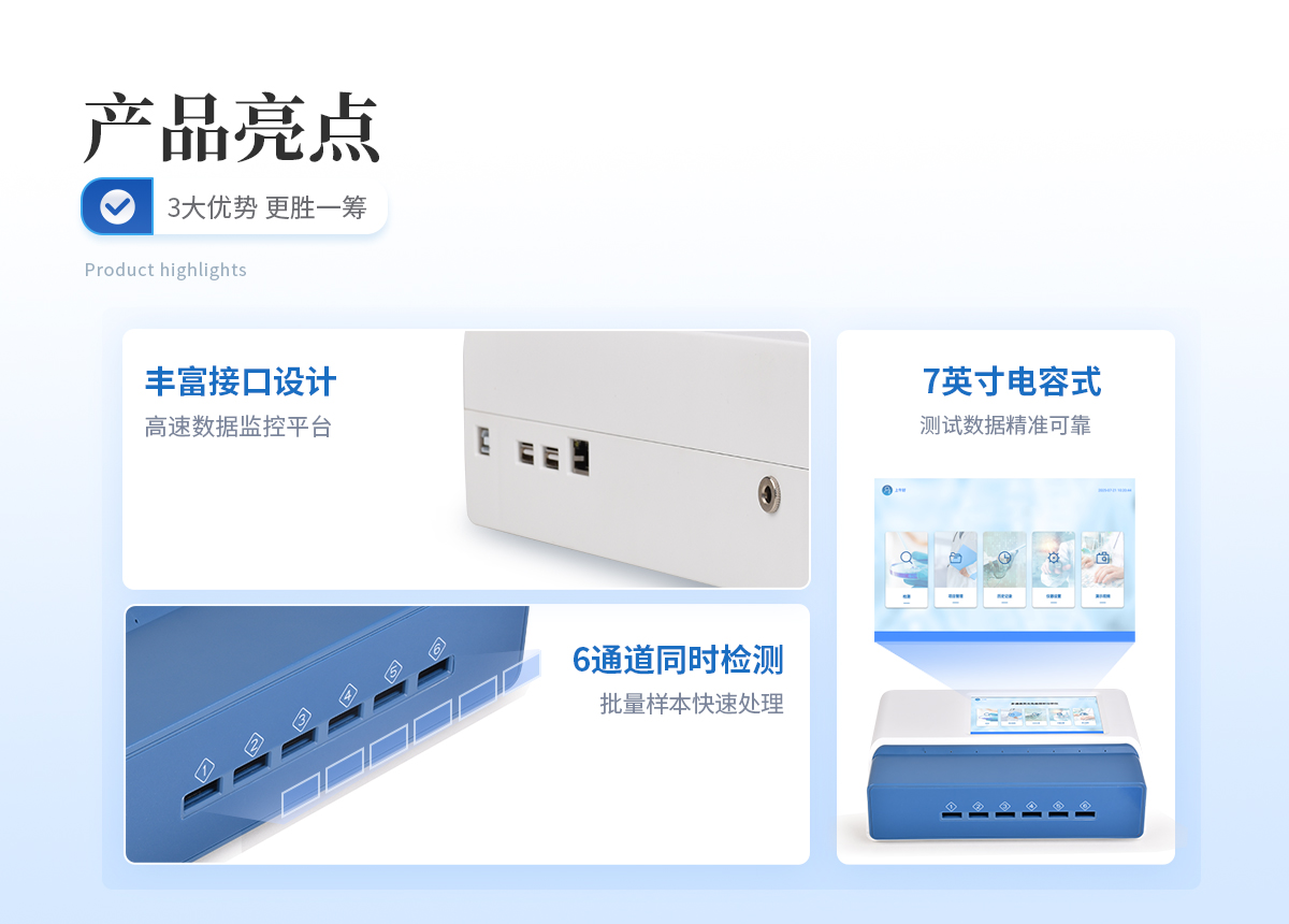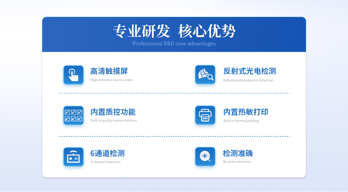 | 1、 Android觸控系統(tǒng)結(jié)合大尺寸高清屏幕,界面友好,操作簡單流暢,無需外接設(shè)備; | 2、 6通道可以同時檢測不同項目,顯著提升檢測效率,滿足批量樣本快速處理需求; | 3、 二維碼掃描錄入樣本信息,避免人工錯誤 | 4、 8G超大容量內(nèi)存,支持按日期靈活查詢、預(yù)覽、刪除結(jié)果,并生成多樣化專業(yè)報告。 | 5、 內(nèi)置熱敏打印機,檢測完成即可現(xiàn)場打印標(biāo)準報告,提升工作效率。 | 6、 關(guān)鍵部件實時自診斷功能,保障儀器長期穩(wěn)定運行。 | 7、 高速有線/無線網(wǎng)絡(luò)及藍牙,構(gòu)建完善的數(shù)據(jù)監(jiān)控平臺,實現(xiàn)數(shù)據(jù)實時上傳、遠程查詢、統(tǒng)計分析和監(jiān)管協(xié)同。 | 8、 豐富的接口設(shè)計,輕松連接電腦、U盤、網(wǎng)絡(luò)及上位機系統(tǒng),支持U盤導(dǎo)出。 | 9、 孵育模塊為特定試紙條反應(yīng)提供**溫度環(huán)境。 | 10、 流線型結(jié)構(gòu),緊湊輕便,兼顧實驗室耐用性與檢測需求。 | 11、 插卡判斷:檢測卡未插入檢測通道不能內(nèi)置質(zhì)控功能,可設(shè)備送檢、設(shè)備自檢、試劑卡自檢測方式:孵育檢測、即時檢測(對檢測數(shù)據(jù)復(fù)檢核實) | 12、 檢測曲線:可以對試劑卡的檢測核驗,防止誤判 | 13、 檢測結(jié)果:報告出檢測項目、被測物質(zhì)的濃度、檢測單位、被檢查單位、檢驗員、檢測時間、檢測限等信息可在觸摸屏上顯示,可通過儀器內(nèi)置打印機輸出 | 14、 項目管理:支持檢測項目拓展功能 | 15、 界面設(shè)置:可修改標(biāo)題和頁尾信息,靈活展示儀器信息 |