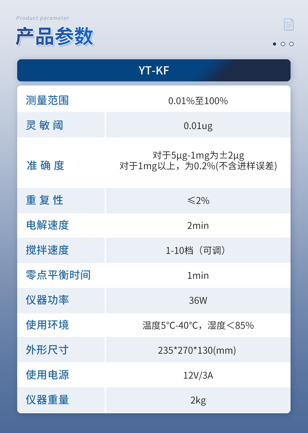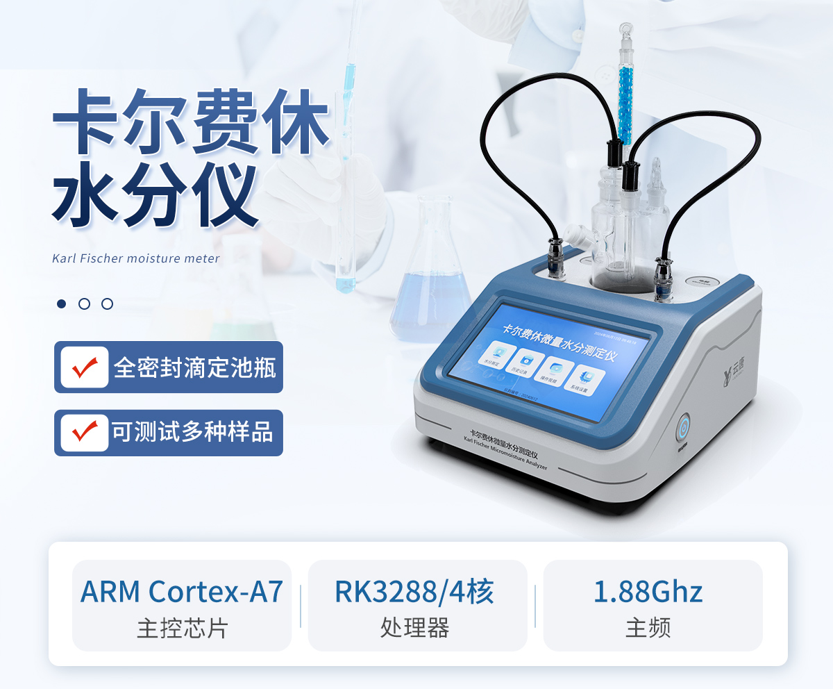 | 微量水分測定儀根據卡爾-菲休滴定原理,采用**的微機電路,測定性質不同的液體、固體中微量水分的含量。對于不溶于試劑的固體,以及與試劑起化學反應的或容易污染電極的物質,可配用相應的固體、液體進樣器,進行間接測定。 | 該儀器具有測定精度高、分析速度快、使用范圍廣、穩定可靠、操作簡單等優點。廣泛用于電力、石油、化工、農藥、醫藥等行業。樣品測定過程由儀器自動控制,攪拌、測定60秒左右自動完成,直接顯示測定結果;全密封滴定池瓶,避免試劑與人接觸,也避免環境濕度的影響; |