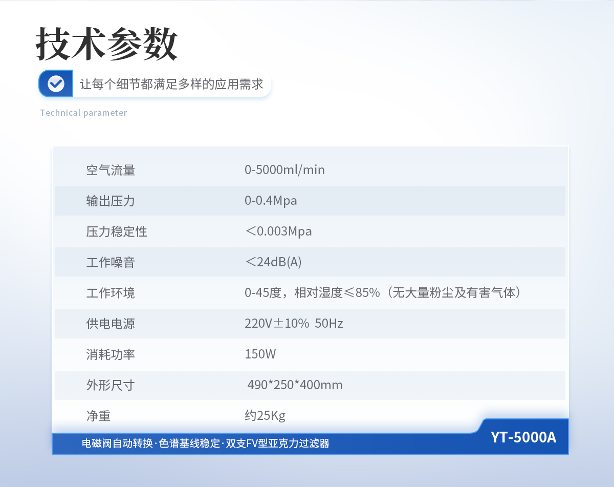 | 1、空氣流量: 0-3000ml/min | 2、輸出壓力: 0-0.4Mpa | 3、壓力穩(wěn)定性:<0.003Mpa | 4、工作噪音: <24dB(A) | 5、工作環(huán)境: 0-45度,相對(duì)濕度≤85%(無(wú)大量粉塵及有害氣體) | 6、供電電源: 220V±10% 50Hz | 7、消耗功率: 2000型(120W) | 8、外形尺寸: 490*250*400mm | 9、凈重: 約22Kg |