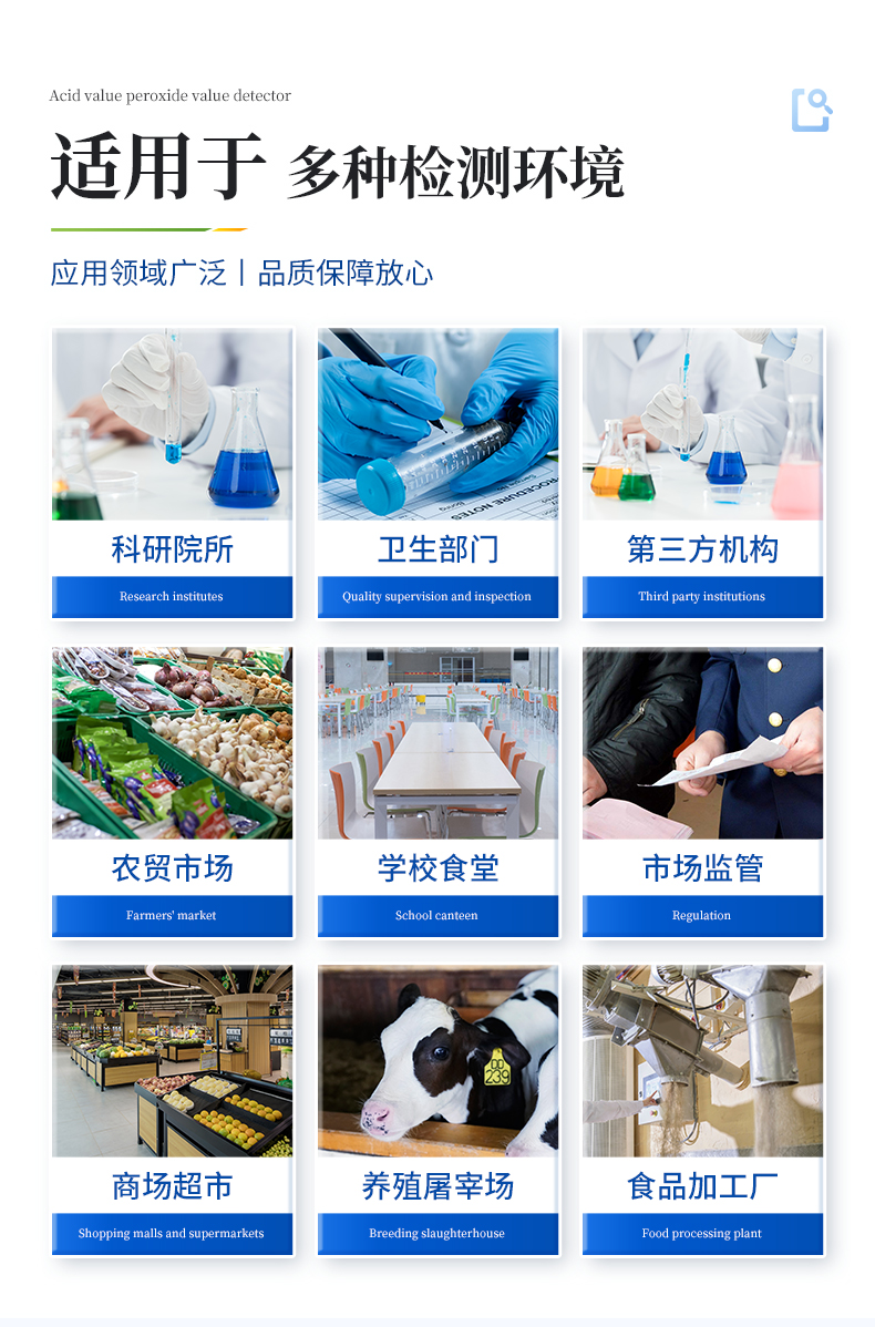 廣泛應用于質(zhì)量監(jiān)督檢驗、工商管理、油炸食品生產(chǎn)基地、食藥監(jiān)局、衛(wèi)生部門、肉制品食品深加工企業(yè)、商場超市、各大食品安全監(jiān)測系統(tǒng)等單位使用。
