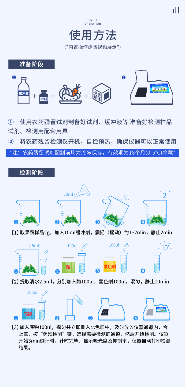 廣泛應用于主要用于蔬菜、水果、茶葉、糧食、農副產品等食品中有機磷和氨基甲酸酯類農藥殘留的快速檢測;此外還可用于果蔬茶生產基地和農貿批發銷售市場現場檢測,餐館、學校、食堂、家庭果蔬加工前的安全速測等。