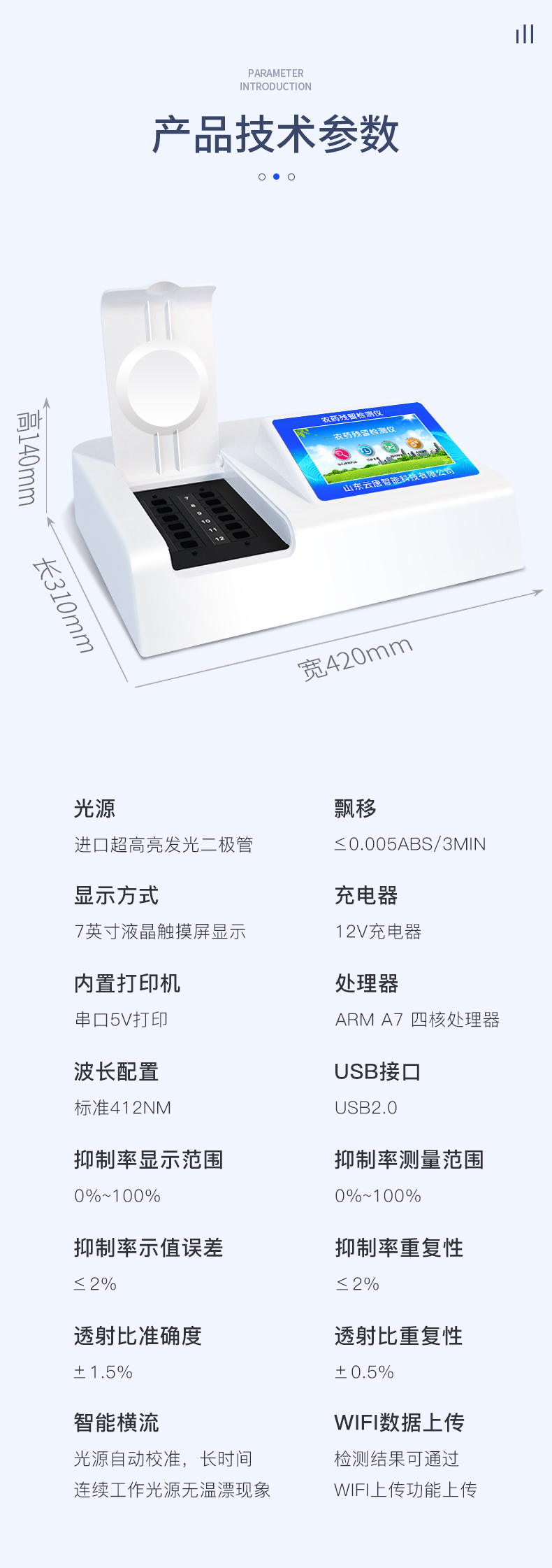 檢測標準:依據國家標準方法(GB/T5009.199-2003)以及世界衛生組織WHO、世界糧農組織FAO殘留農藥檢測標準、世界環境保護局EPA參照攝入量等要求來設計。采用酶抑制率比色法對水果、蔬菜等農林產品中有機磷和氨基甲酸酯類農藥含量進行快速準確的檢測。