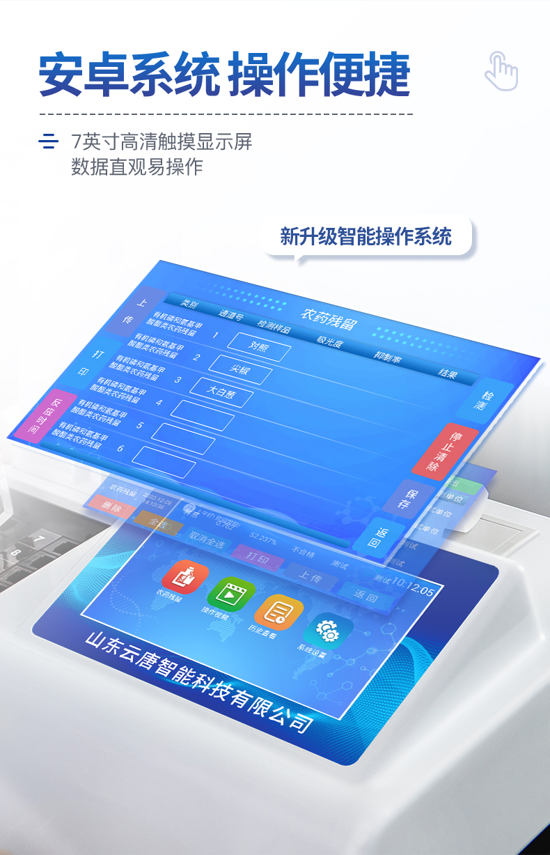 | 乙酰膽堿酯酶和丁酰膽堿酯酶試劑均可以使用,符合國(guó)家標(biāo)準(zhǔn)和農(nóng)業(yè)部標(biāo)準(zhǔn)的要求。 | 自動(dòng)判斷樣品是否合格,檢測(cè)結(jié)果更加直觀。 | 儀器具有100多種蔬菜名稱菜單庫,分類管理,并可按需添加或刪除蔬菜名,編輯蔬菜名稱,可直接打印出蔬菜名稱。 | 檢測(cè)通道:12個(gè)檢測(cè)通道,可以同時(shí)測(cè)試多個(gè)樣品,循環(huán)檢測(cè),即放即檢,每個(gè)樣品由程序控制分別獨(dú)立工作,不會(huì)互相干擾。 | 智能操作系統(tǒng),采用更加人性化操作,主控采用多核處理器,主頻1.88Ghz,運(yùn)轉(zhuǎn)速度更快速,穩(wěn)定性更強(qiáng)。 | 顯示方式:7英寸高靈敏真彩觸摸屏顯示,人性化中文操作界面,讀數(shù)直觀、簡(jiǎn)單。 | 打印機(jī)采用串口5v打印,可選擇手動(dòng)打印或者自動(dòng)打印,三分鐘出打印結(jié)果,打印格式為檢測(cè)人姓名、吸光度差值、檢測(cè)時(shí)間、檢測(cè)機(jī)構(gòu)、樣品名稱及結(jié)果判定。 | 光源采用進(jìn)口超高亮發(fā)光二極管,具有低功耗、高精度、穩(wěn)定性強(qiáng)、光源可控可以關(guān)掉不使用的光源,響應(yīng)速度快等優(yōu)點(diǎn)。 | 智能恒流穩(wěn)壓,光強(qiáng)自動(dòng)校準(zhǔn),長(zhǎng)時(shí)間連續(xù)工作光源無溫漂現(xiàn)象。 | 儀器具有GPRS遠(yuǎn)傳功能,可插手機(jī)卡實(shí)現(xiàn)數(shù)據(jù)遠(yuǎn)傳平臺(tái),wifi聯(lián)網(wǎng)功能,可將數(shù)據(jù)快速上傳電腦,進(jìn)行數(shù)據(jù)管理與統(tǒng)計(jì)。 | 采用USB2.0接口設(shè)計(jì),方便數(shù)據(jù)的存貯和移動(dòng),并可隨時(shí)與計(jì)算機(jī)直接相連,并且可用計(jì)算機(jī)控制儀器。實(shí)現(xiàn)數(shù)據(jù)查詢、瀏覽、分析、統(tǒng)計(jì)、打印等。 | 智能化程度高,儀器具有自檢功能:具有開機(jī)自檢和調(diào)零功能,具有自動(dòng)檢測(cè)重復(fù)性功能 | 儀器具有自身保護(hù)功能,可設(shè)置用戶名及密碼,防止非工作人員操作等。 | 采用DC12v直流供電,安全系統(tǒng)更高,并且配備6A鋰電池充電器。 | 儀器具有重新校準(zhǔn)、鎖定、恢復(fù)出廠設(shè)置功能。 |