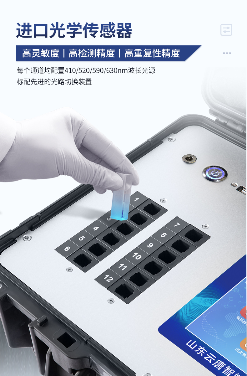 | 1、主控芯片采用ARM Cortex-A7,RK3288/4核處理器,主頻1.88Ghz,運轉速度更快速,穩定性更強。 | 2、★顯示方式:10英寸液晶觸摸屏顯示,人性化中文操作界面,讀數直觀、簡單。 | 3、交直流兩用,直流12V供電,可連接車載電源,可配6ah大容量充電鋰電池,方便戶外流動測試。 | ★4、★四波長冷光源,24個檢測通道,每個通道均配置410、520、590、630nm波長光源,標配**的光路切換裝置,專業光路切換功能可實現*多64波長,并且所有檢測項目可實現所有通道同時檢測。 | 5、智能恒流穩壓,光強自動調節與校準,長時間連續工作光源無溫漂現象。 | ★6、內置新國家限量標準,與所測結果進行現場比對,并持續更新標準。 | 7、不間斷進樣,連續檢測 | 8、樣本編號自動累加。 | 9、檢測結果為Excel表格,連接電腦即可拷貝。 | 10、檢測結果存儲容量20萬條。 | ★11、同時支持U盤拷貝,標準USB接口,免驅動插拔。 | 12、檢測項目可擴充,固件可升級 | 13、儀器尺寸:43×35×19cm, 主機凈重:5.1kg | 14、儀器包裝尺寸:510*390*375mm 包裝重量:9.1kg |