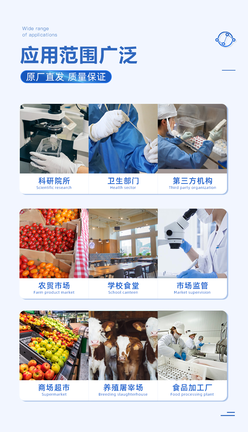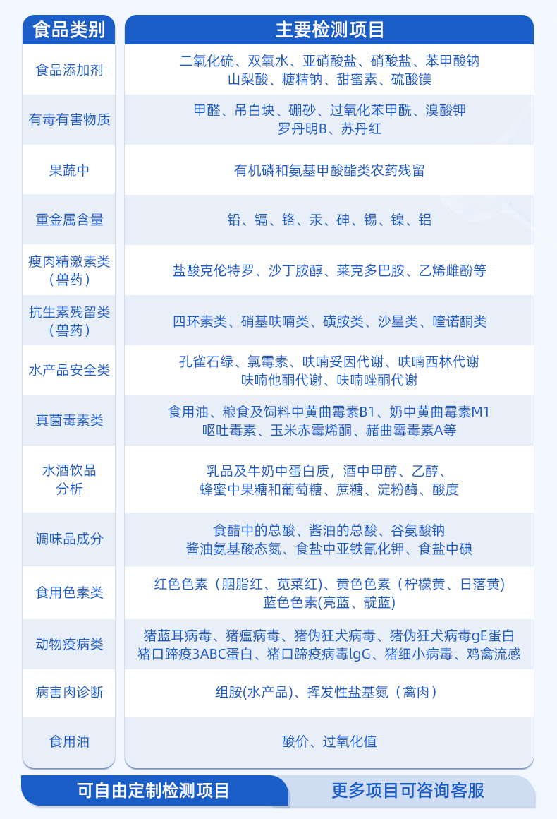 食品添加劑:二氧化硫、雙氧水、亞硝酸鹽、硝酸鹽、苯甲酸鈉、山梨酸、糖精鈉、甜蜜素、安賽蜜、硫酸鎂等有毒有害物質:甲醛、吊白塊、硼砂、過氧化苯甲酰、溴酸鉀、羅丹明B、三聚氰胺、蘇丹紅等瓜果蔬菜藥殘:農藥殘留(酶抑制率法)病害肉診斷:組胺、揮發性鹽基氮、肉制品酸價、水發產品中組胺重金屬含量:鉛、鎘、鉻、汞、砷、錫、鎳、鋁等;食用油脂檢測:過氧化值、酸價、油脂丙二醛等。食用油脂檢測::過氧化值、酸價等瘦肉精激素類(獸藥):鹽酸克倫特羅、沙丁胺醇、萊克多巴胺、己烯雌酚等抗生素殘留類(獸藥):四環素類、硝基呋喃類、磺胺類、β-興奮劑類、沙星類、磺胺類、喹諾酮類,甲砜霉素,氟苯尼考,金剛烷胺、替米考星、慶大霉素、林可霉素、鏈霉素、恩諾沙星、環丙沙星、頭孢啦啶、青霉素、阿莫西林等真菌毒素類:食用油、糧食及飼料中黃曲霉毒素B1、奶中黃曲霉毒素M1、嘔吐毒素、玉米赤霉烯酮、赭曲霉毒素A等水酒飲品分析:乳品及牛奶中蛋白質;酒中甲醇、乙醇、雜醇油;蜂蜜中果糖和葡萄糖、蔗糖、淀粉酶、酸度;水中氰化物、余氯,飲料中維C等調味品成分:食醋的總酸、醬油的總酸、芝麻油純度、谷氨酸鈉、醬油氨基酸態氮、食鹽中亞鐵氰化鉀、食鹽中碘等食用色素類:紅色色素(胭脂紅、莧菜紅、赤蘚紅、誘惑紅)、黃色色素(檸檬黃、日落黃)、藍色色素(亮藍)等動物疫病類:豬藍耳病毒、豬瘟病毒、豬偽狂犬病毒、豬偽狂犬病毒gE蛋白、豬口蹄疫3ABC蛋白、豬口蹄疫病毒IgG、豬細小病毒、雞禽流感等蜂蜜中:果糖和葡萄糖、蔗糖、淀粉酶、酸度等水產品安全類:孔雀石綠、氯霉素、呋喃妥因、呋喃西林、呋喃它酮、呋喃唑酮等