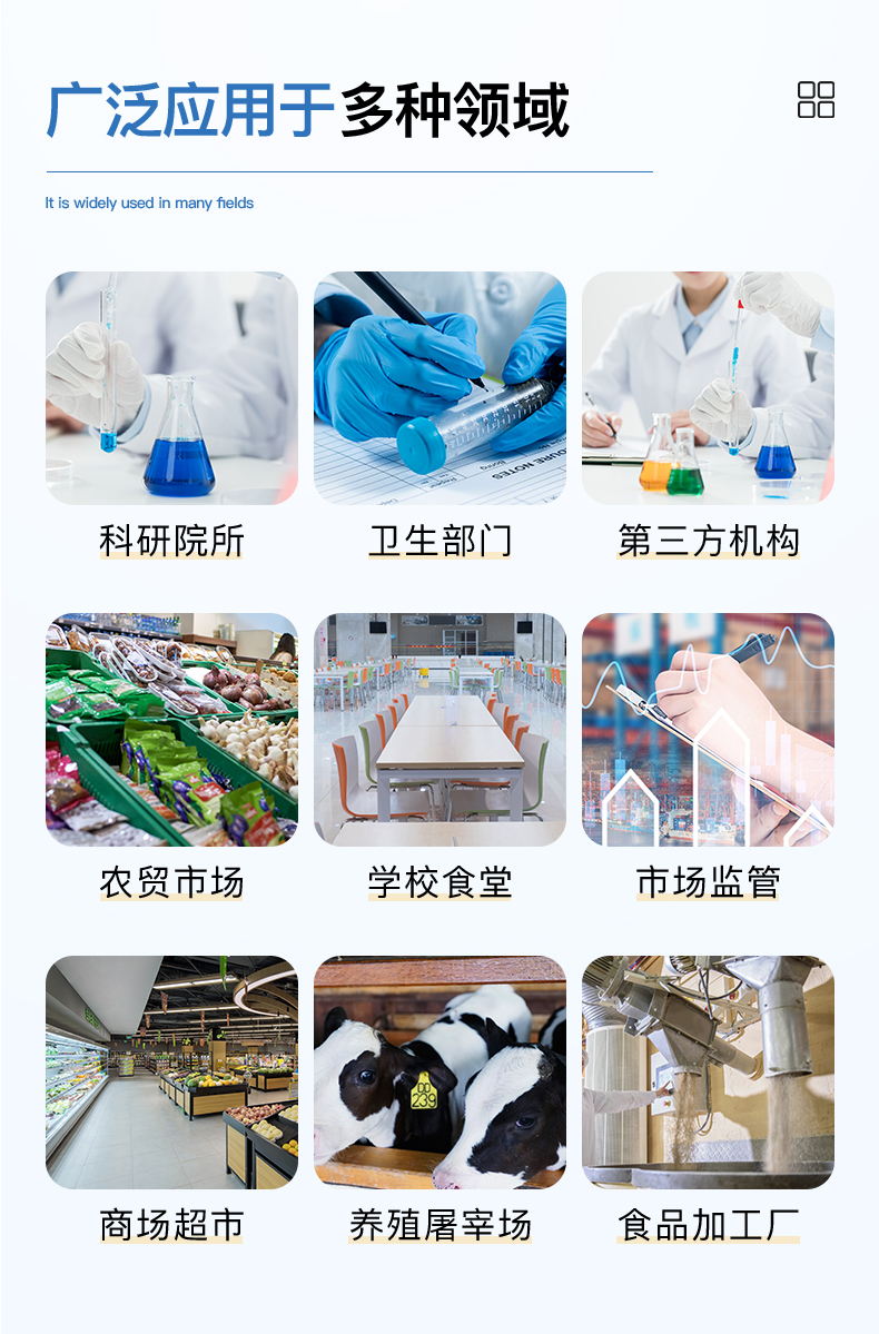 該多功能食品安全檢測儀為集成化食品安全快速檢測分析設(shè)備,廣泛應(yīng)用于食藥監(jiān)局、衛(wèi)生部門、高教院校、科研院所、農(nóng)業(yè)部門、養(yǎng)殖場、屠宰場、食品肉產(chǎn)品深加工企業(yè)、檢驗(yàn)檢疫部門等單位使用。