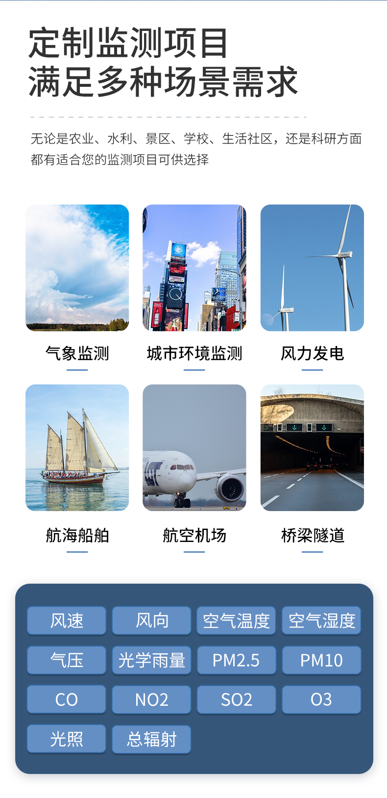山東云唐智能科技有限公司作為專業研發生產銷售微型氣象儀的企業,一直致力于微型氣象儀和氣象環境解決方案推廣應用。具有完整的生產鏈、實力雄厚的技術團隊和全面的營銷團隊,我們研發生產的超聲波風速風向儀、五要素微氣象儀、六要素微氣象儀和小型自動氣象站等氣象產品,已廣泛應用到氣象監測、城市環境監測、風力發電、航海船舶、航空機場、橋梁隧道等領域,客戶遍布全國各地,并取得了良好的社會效益和經濟效益。
