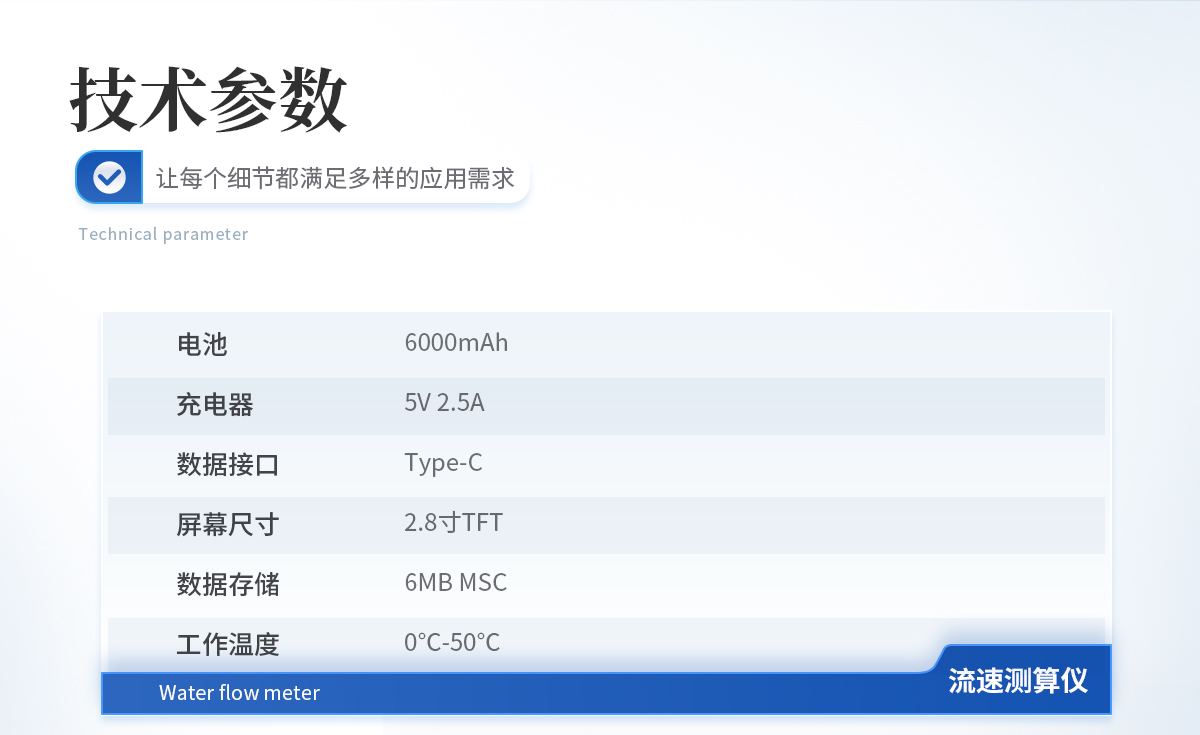 | 起轉速度 :0.03m/s | 公式范圍 :0.01—4.00m/s(可到5.00m/s) | 供電電壓:3.3V | 測算誤差 :≤1.5% | 測量深度 :410mm |