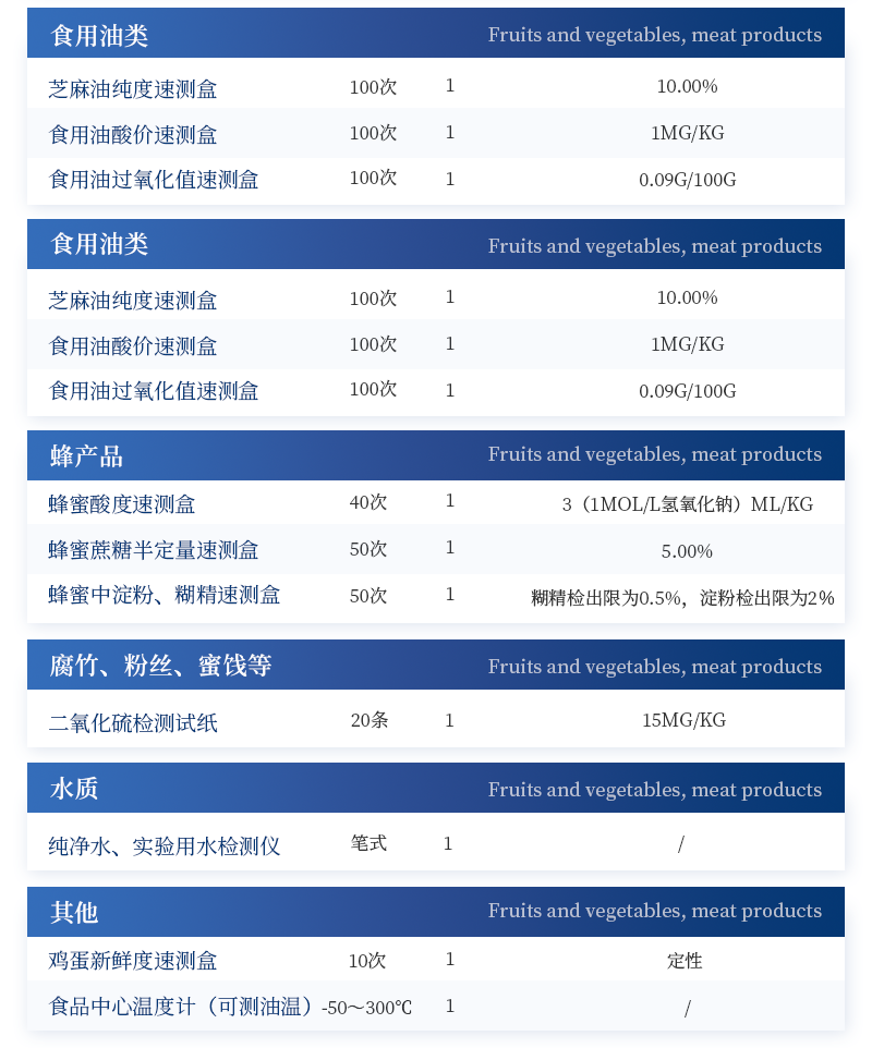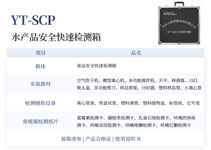 水產品安全快速檢測箱 序號 適用范圍 檢測項目 規格 單位 數量 檢測限 檢測范圍 1 果蔬、肉制品類 農藥殘留速測卡 20次 盒 5 0.3-3.5mg/kg / 亞硝酸鹽速測試紙 20條 套 1 2mg/kg 0-40mg/kg 硝酸鹽速測管 20次 盒 1 0.5mg/kg 0.5-10mg/kg(以N計) 瘦肉精三聯卡(組織) 各10次 包 1 鹽酸克倫克羅、萊克多巴胺3ppb,沙丁胺醇5ppb / 注水肉檢測試紙 50條 袋 1 定性 / 2 乳品類 三聚氰胺檢測卡 10條 包 1 100ppb / 乳品蛋白質含量速測盒 25次 盒 1 牛乳:1% 奶粉:5% 牛乳0-5%; 乳粉0-25% 3 豆制品 豆漿生熟度速測盒 50次 盒 1 定性 / 4 水發產品 甲醛檢測試紙 20條 套 1 10mg/kg / 雙氧水速測試紙 20條 套 1 5mg/kg 0-30mg/kg 水發食品中工業堿速測試紙 20條 套 1 0.4g/L / 5 糧食、堅果 硼酸和硼砂速測盒 100次 盒 1 25mg/kg 定性 吊白塊半定量速測盒 100次 盒 1 2.5mg/kg 0-100mg/L 大米新陳度檢測噴劑 50次 盒 1 定性 / 大米中石蠟/礦物油速測盒 100次 盒 1 1.00% / 黃曲霉毒素B1檢測卡 10次 包 1 0.5ppb / 6 食用油類 食用油酸價速測盒 100次 盒 1 1mg/kg 0-8mg/kg 食用油過氧化值速測盒 100次 盒 1 0.09g/100g 0.09-0.45g/100g 7 調味品 食醋總酸速測盒 20次 盒 1 0.26g/100mL / 工業乙酸速測盒 100次 盒 1 定性 / 食醋游離礦酸速測試紙(淺色醋) 20條 套 1 0.50% / 食醋游離礦酸速測試紙(深色醋) 20條 套 1 0.50% / 食鹽含碘量速測試紙 20條 套 1 15mg/kg 0-40mg/kg 味精谷氨酸鈉速測盒 15次 盒 1 2.60% / 醬油總酸與氨基酸態氮速測盒 20次 盒 1 總酸: 0.45g/100mL氨基酸態氮:0.078g/100mL / 8 腐竹、粉絲、蜜餞等 二氧化硫檢測試紙 20條 套 1 15mg/kg 0-150mg/kg 9 其他 雞蛋新鮮度速測盒 10次 盒 1 定性 / 食品中心溫度計(可測油溫) -50~300℃ 支 1 / / 10 箱體預裝輔助設備 食品安全快速檢測箱I 便攜式 個 1 / / 便攜水浴鍋 功率300W 個 1 多功能剪刀 - 把 1 計算器 - 個 1 洗瓶 250ml 個 1 塑料滴管 3ml 根 10 塑料滴管 0.2ml 根 50 樣品管架 10ml 個 1 天平 0.1-200g 個 1 移液器 1mL 支 1 玻璃三角瓶 100ml 個 2 玻璃樣品管 10ml 個 2 小離心管 1.5ml 個 24 塑料樣品管 10ml 個 10 樣品瓶 50ml 個 2 離心管架 1.5ml 個 1 燒杯 250ml 個 1 量筒 100ml 個 1 手套 - 包 1 計時器 - 個 1 槍頭 1ml 個 20 組織提取器 便攜式 個 1 錫箔紙 10張/包 包 1 裝箱清單 - 份 1 產品合格證 - 份 1 使用說明書 - 份 1 |