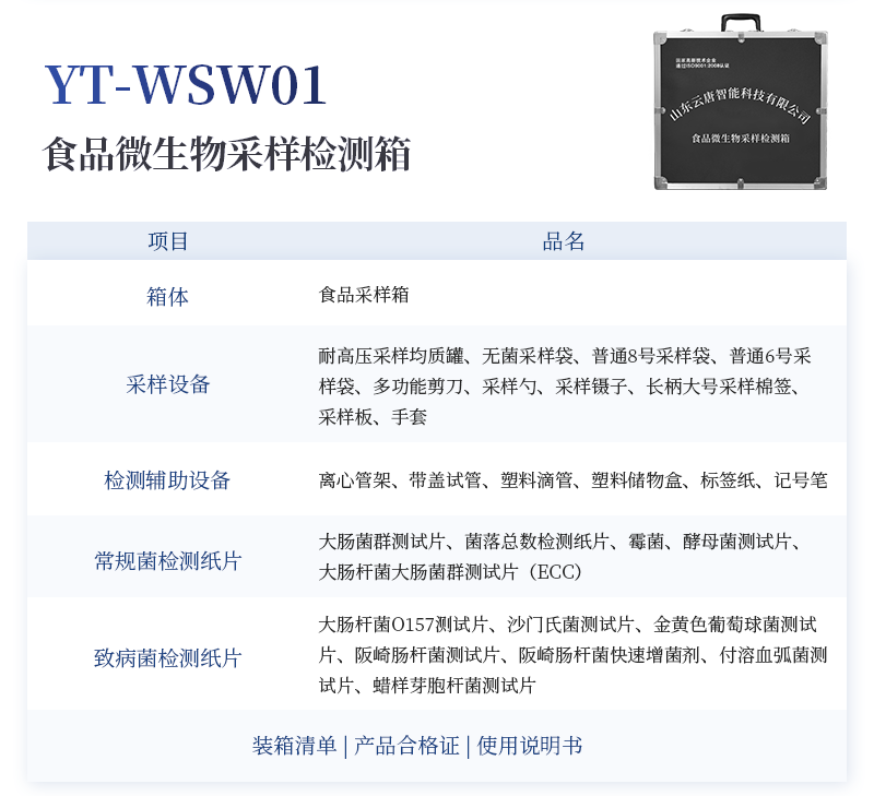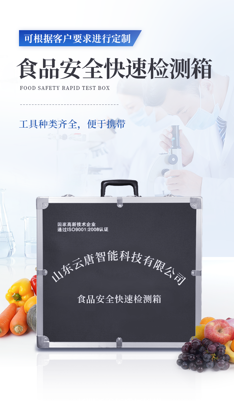 急性中毒快速檢測箱標配箱 序號 適用范圍 檢測項目 規格 單位 數量 檢測限 檢測范圍 1 果蔬、肉制品類 便攜式農藥殘留快速檢測儀 12通道 臺 1 / / 農藥殘留速測卡 20次 盒 3 0.3-3.5mg/kg / 亞硝酸鹽速測試紙 20條 套 1 2mg/kg 0-40mg/kg 砷速測盒 30次 盒 1 砷:2mg/kg / 汞速測盒 30次 盒 1 汞:20mg/kg / 瘦肉精三聯卡(組織) 各10次 包 2 鹽酸克倫克羅、萊克多巴胺3ppb,沙丁胺醇5ppb / 2 豆制品 奶制品 液態奶新鮮度速測盒 20次 盒 1 0.60T / 豆漿生熟度速測盒 50次 盒 1 定性 / 3 飲料、酒類 甲醇速測盒(濃硫酸自備) 25次 盒 1 0.02g/100mL 0-0.32g/100mL 4 糧食、干果 黃曲霉毒素B1檢測卡 10次 包 1 0.5ppb / 5 食用油類 食用油酸價速測盒 100次 盒 1 1mg/kg 0-8mg/kg 食用油過氧化值速測盒 100次 盒 1 0.09g/100g 0.09-0.45g/100g 6 食物及水 中毒物殘留 毒鼠強速測盒(乙酸乙酯自備) 10次 盒 1 2mg/kg / 敵鼠鈉鹽速測盒 100次 盒 1 100mg/kg / 氰化物檢測試紙 20條 套 1 1mg/L 0-10mg/L 氟乙酰胺速測盒 30次 盒 1 50mg/kg / 硼酸和硼砂速測盒 100次 盒 1 25mg/kg 定性 鼠藥安妥檢測試紙 40次 包 1 0.02mg/g,mL / 鼠藥磷化鋅速測盒 10次 包 1 20mg/kg / 7 箱體預裝輔助設備 急性中毒箱箱體 便攜式 個 1 / / 便攜水浴鍋 功率300W 個 1 多功能剪刀 - 把 1 計算器 - 個 1 洗瓶 250ml 個 1 塑料滴管 3ml 根 10 塑料滴管 0.2ml 根 50 樣品管架 10ml 個 1 天平 0.1-200g 個 1 移液器 1mL 支 1 玻璃三角瓶 100ml 個 2 玻璃樣品管 10ml 個 2 小離心管 1.5ml 個 24 塑料樣品管 10ml 個 10 樣品瓶 50ml 個 2 離心管架 1.5ml 個 1 燒杯 250ml 個 1 量筒 100ml 個 1 手套 - 包 1 計時器 - 個 1 槍頭 1ml 個 20 組織提取器 便攜式 個 1 錫箔紙 10張/包 包 1 裝箱清單 - 份 1 產品合格證 - 份 1 使用說明書 - 份 1 |