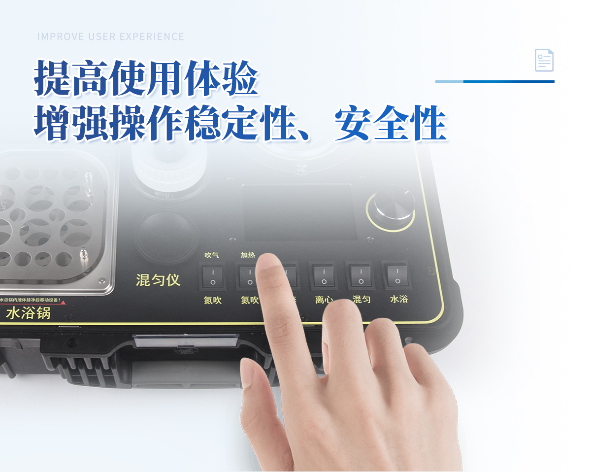 | 1、功能緊湊,集成五種樣品前處理常用的功能,完成樣品一站式處理。 | 2、結(jié)構(gòu)穩(wěn)固,機箱采用***工程塑料,具備**的抗沖擊性、耐腐蝕性、便攜性。 | 3、操作穩(wěn)定,機器采用五寸全彩色液晶屏,功能指示性強,用戶操作均為實體開關(guān),杜絕佩戴手套和液體噴濺時的操作失效。 |