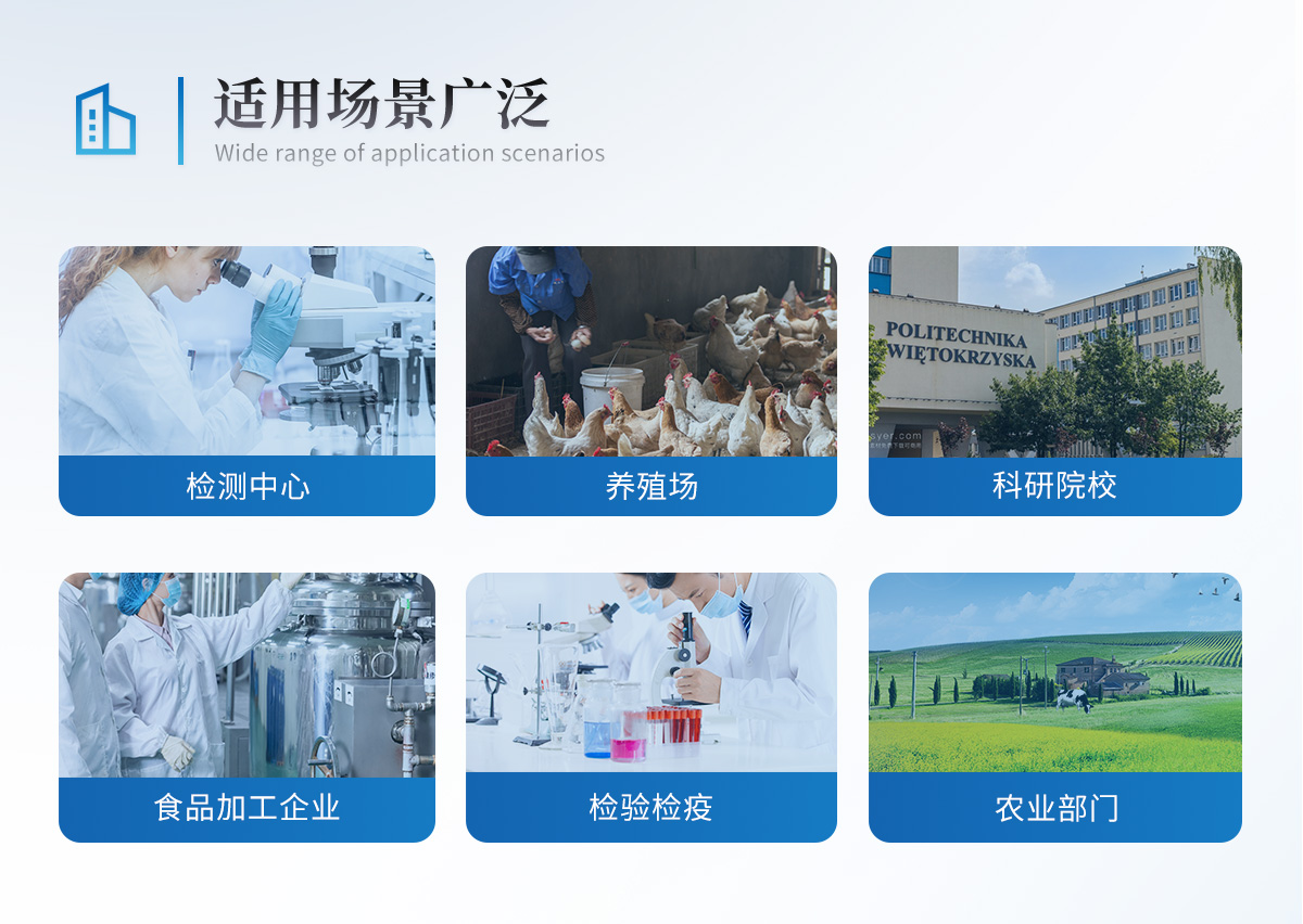 | 瘦肉精激素:鹽酸克倫特羅、沙丁胺醇、萊克多巴胺、己烯雌酚等 | 抗生素殘留:四環素類、硝基呋喃類、磺胺類、β-興奮劑類、沙星類、磺胺類、喹諾酮類,甲砜霉素,氟苯尼考,金剛烷胺、替米考星、慶大霉素、林可霉素、鏈霉素、恩諾沙星、環丙沙星、頭孢啦啶、青霉素、阿莫西林等 | 水產品安全類:孔雀石綠、氯霉素、呋喃妥因、呋喃西林、呋喃它酮、呋喃唑酮等 | 蛋類藥物殘留:禽流感、新城疫、牛羊口蹄疫、牛羊結核病、牛羊包蟲、牛羊布病、小反芻獸、豬藍耳病毒、豬瘟病毒、豬偽狂犬病毒、豬細小、豬圓環、犬細小病毒、犬瘟熱病毒、犬狂犬病毒等 | 動物疫病類:孔雀石綠、氯霉素、呋喃妥因、呋喃西林、呋喃它酮、呋喃唑酮等 | 真菌毒素殘留:食用油、糧食及飼料中黃曲霉毒素B1、黃曲霉毒素總量,奶中黃曲霉毒素M1、嘔吐毒素、玉米赤霉烯酮、赭曲霉毒素A、T2毒素、伏馬毒素等 |