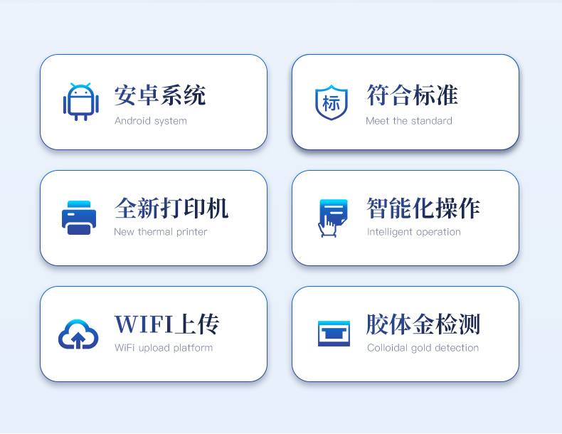 | 1、安卓智能操作系統,采用更加**和人性化操作,儀器具有wifi聯網上傳、4G聯網傳輸、GPRS無線遠傳、網線連接功能,快速上傳數據。 | 2、智能化程度高,儀器具有自檢功能:具有開機自檢和調零功能,具有自動檢測重復性功能。 | 3、新一代高速熱敏打印機,檢測完成可自動打印檢測報告和二維碼。 | 4、儀器帶有監管平臺,數據可局域網和互聯網數據上傳,檢測結果直接傳至食品安全監管平臺。進行區域食品安全監管及大數據分析處理與數據統計,檢測區域食品安全長短期動態,達到食品安全問題預估、預警 | 5、一體化便攜式快檢設備,滿足現場及流動檢測使用需求,能夠在同一軟件下實現所有檢測項目的檢測,并可通過同一窗口直觀顯示檢測結果。 | 6、膠體金模塊檢測方式:軌道式自動傳輸掃描,檢測完成后自動退出檢測卡。 | 7、儀器內置攝像頭拍照,可顯示金標卡實時圖像,系統自動分析并呈現出CT曲線圖,CT線自動識別,無需手動調整。 | 8、儀器具有品類多種類樣品菜單庫,可靈活選擇檢測樣品,不同的檢測通道可同時檢測不同的樣品項目。 | 9、樣品處理簡單省力,整體操作快速、安全、便捷。 | 10、高靈敏度,高檢測精度,高重復性精度,掃描式高精度光學傳感器。 | 11、內置強大的數據庫,可在儀器上直接選擇樣品名稱、檢測指標、送檢單位等信息,也可在儀器上直接編輯錄入樣品名稱、檢測指標、送檢單位等信息并保存進樣品數據庫。 | 12、儀器具有自身保護功能,可設置用戶名及密碼,防止非工作人員操作等。 | 13、儀器具有重新校準、鎖定、恢復出廠設置功能。 | 14、結果判定線可修改,對照值標定值可保存,斷電不丟失數據。 | 15、兼容市場上所有的膠體金卡,使用耗材不受限制,極大增強用戶使用體驗。 |