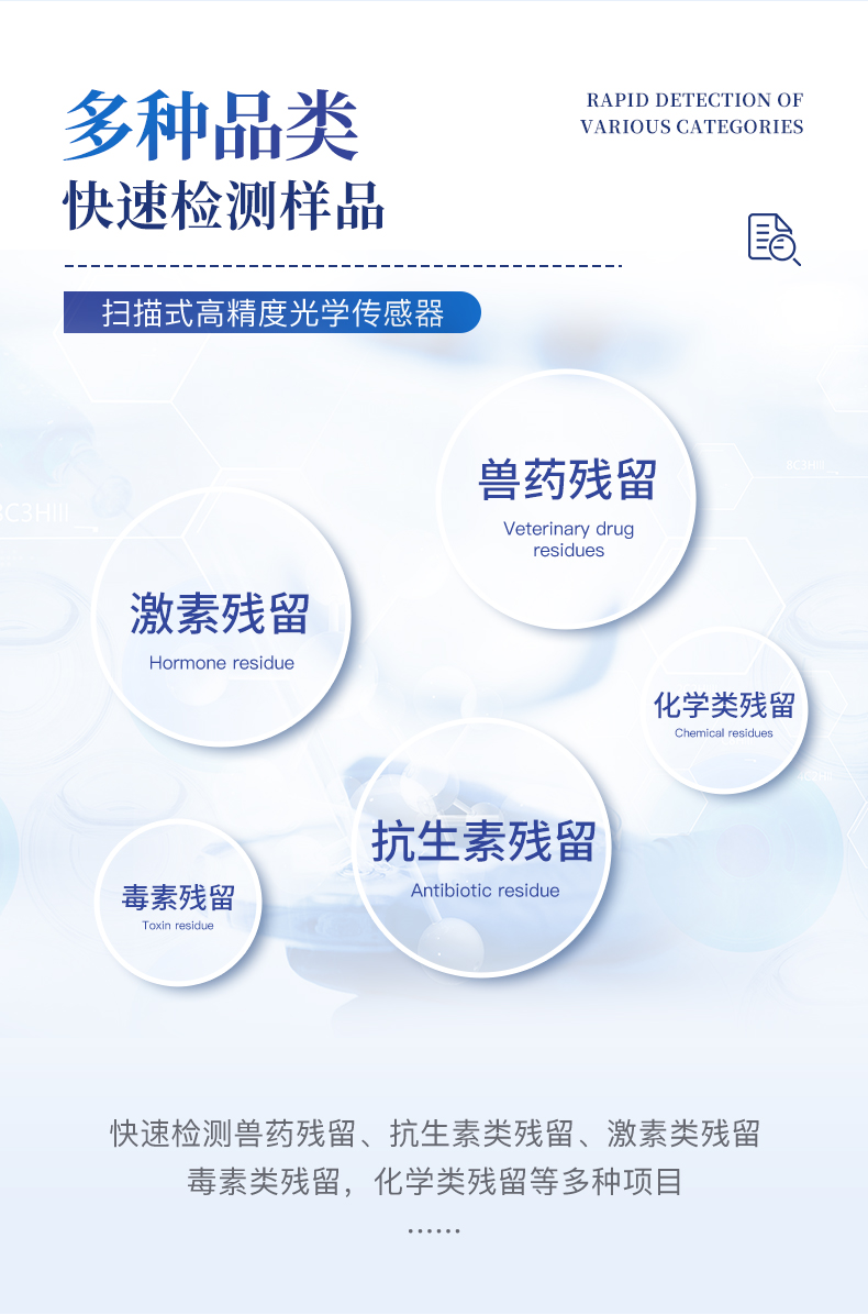| 瘦肉精激素類(獸藥):鹽酸克倫特羅、沙丁胺醇、萊克多巴胺、己烯雌酚、喹乙醇等 | 抗生素殘留類(獸藥):四環素類、硝基呋喃類、磺胺類、沙星類、喹諾酮類、慶大霉素、鏈霉素、阿莫西林、紅霉素等 | 水產品安全類:孔雀石綠、氯霉素、呋喃妥因代謝、呋喃西林代謝、呋喃它酮代謝、呋喃唑酮代謝等 | 以及病害肉及肉類新鮮度的擴展檢測。 |