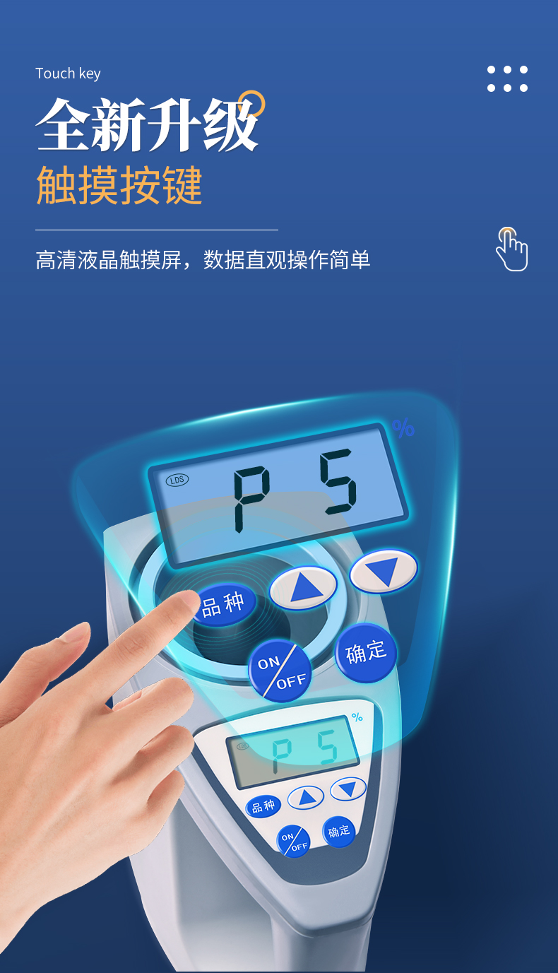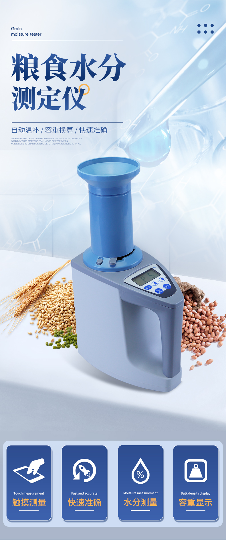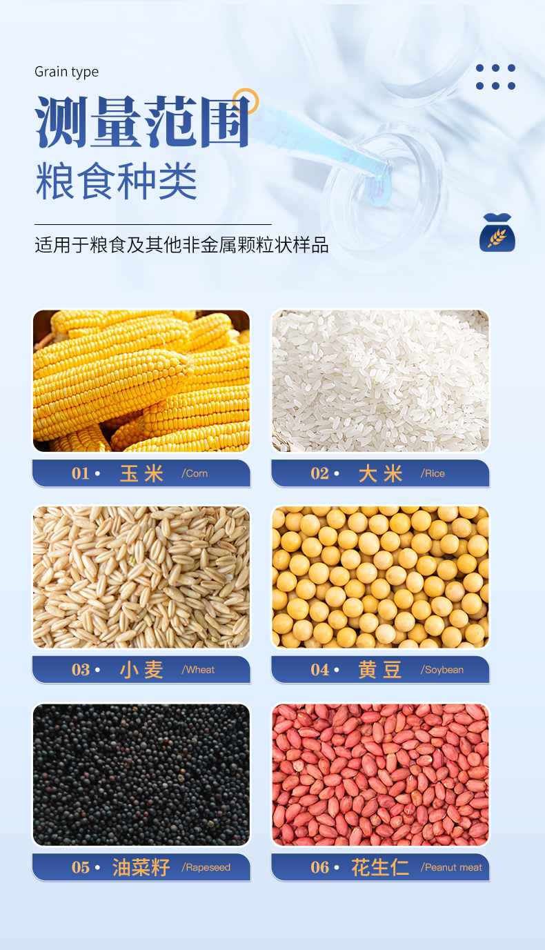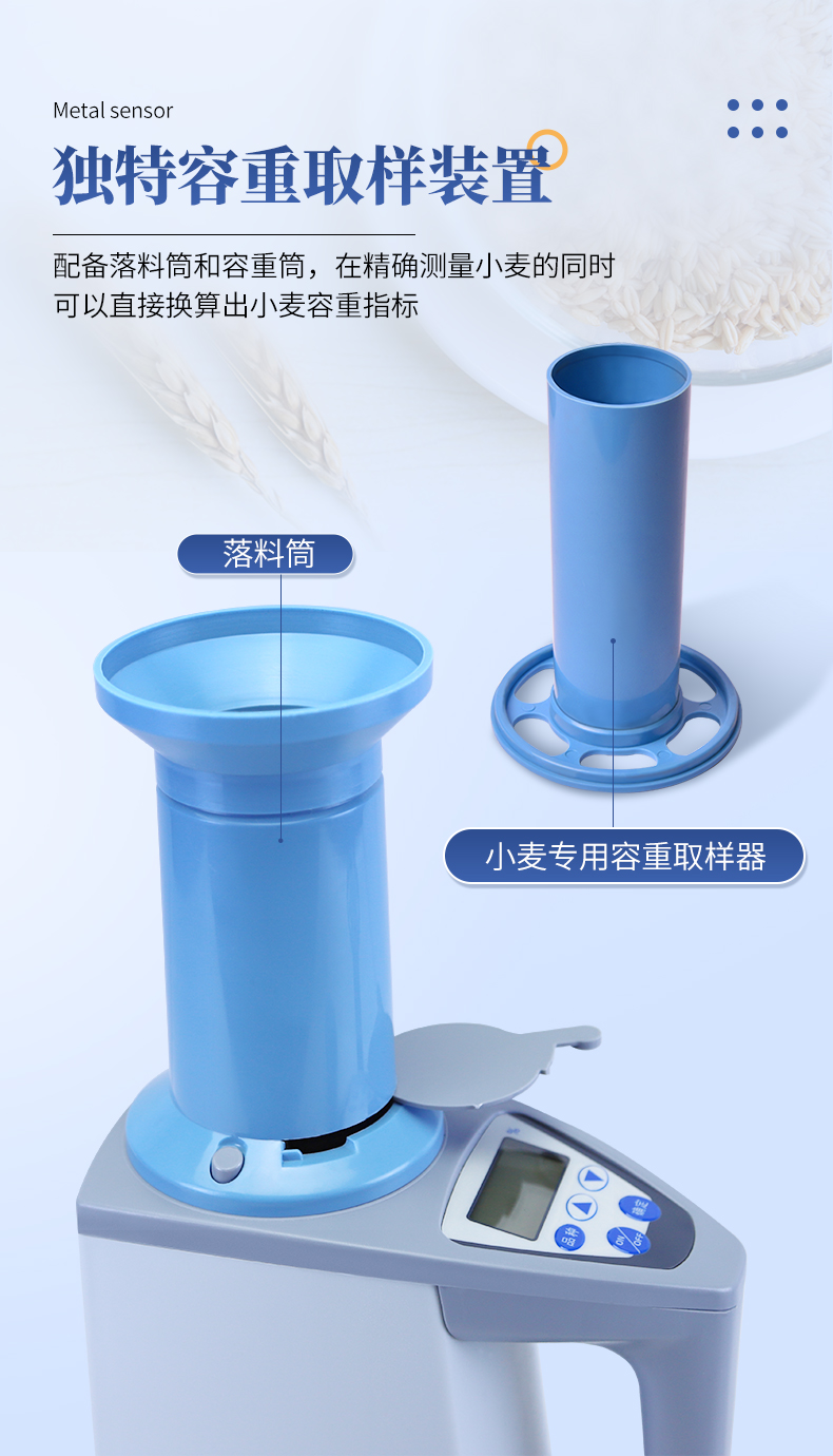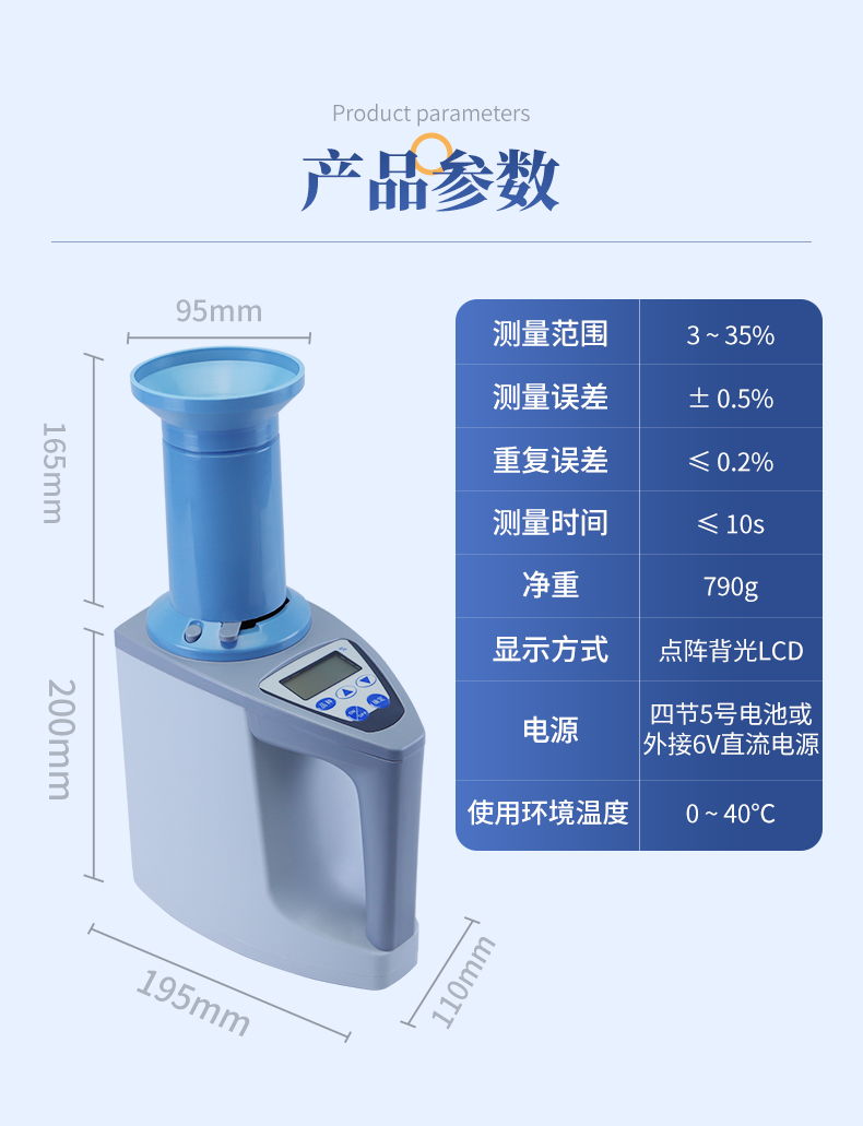 | 容重?fù)Q算:獨(dú)特的專利容重取樣裝置在**測(cè)量小麥的同時(shí),可以直接換算出小麥容重指標(biāo)。 | 測(cè)量范圍:可測(cè)量谷類、玉米、東北玉米、大麥、小麥、白小麥、大米、豆粕、花生仁、菜粕、高粱、黑芝麻、棉籽、棉粕、秈谷、大豆、油菜籽、飼料、蔬菜種子等非金屬顆粒狀物質(zhì)。 | 快速準(zhǔn)確:數(shù)秒內(nèi)即可顯示結(jié)果,測(cè)量誤差≤±0.5℅ | 操作簡(jiǎn)單:20個(gè)常見品種已預(yù)先定標(biāo),不需秤樣、用料簡(jiǎn)取樣后可立即測(cè)量水分 | 水分測(cè)量范圍:3-35℅ | 使用環(huán)境溫度:0~40℃ | 溫度補(bǔ)償:自動(dòng) | 定 標(biāo):浮動(dòng)四點(diǎn)定標(biāo),品種不限(常見品種20個(gè)已預(yù)先定標(biāo),可直接測(cè)量) | 工作電源,直流6V(5號(hào)干電池四節(jié)) | 自動(dòng)關(guān)機(jī):超過三分鐘無操作自動(dòng)關(guān)機(jī)。 | 便攜方便:重約1千克、外型小巧、電源交直流二用,適合各種工作場(chǎng)合 | 適合國情:用戶可對(duì)本地特殊品種采用本機(jī)獨(dú)創(chuàng)的四點(diǎn)定標(biāo)法自行定標(biāo),自行修正水分值 | 高性價(jià)比:技術(shù)含量高,性能**而價(jià)格相比同類產(chǎn)品較低。 |