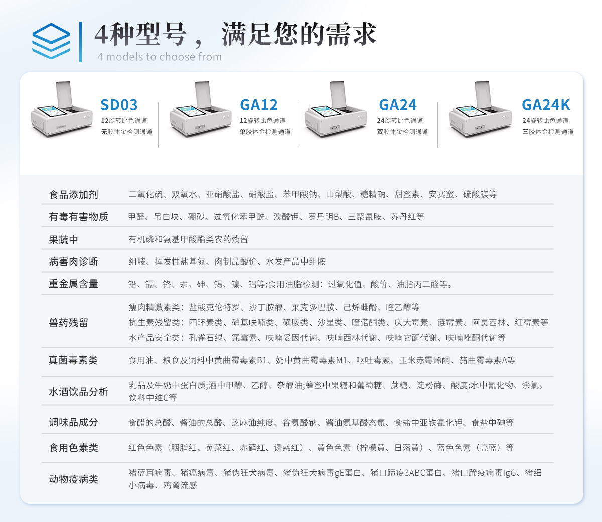 | 儀器采用臺式一體化系統檢測技術,將分光光度模塊、新型農殘檢測模塊、數字化管理模塊、無線通訊模塊高度集成于一體,支持檢測200種食品安全檢測項目,同時預留升級檢測方法。 | 儀器檢測模塊標準化、智能化,可隨意自由組合。檢測箱體內置多個標準檢測單元,檢測模塊可以調整配置。 | 儀器采用全新安卓智能系統,主控芯片采用 ARM Cortex-A7,RK3288/4核處理器,10.1寸高清液晶觸摸豎屏,更加**的UI交互界面,運轉快捷;儀器配備無線通信模塊: 4G(APN)通訊模塊、Wifi模塊,藍牙傳輸,同時具有雙USB接口以及RJ45接口能以多種方式實現數據保存和數據傳輸功能。 | 創新檢測模式: | ★檢測通道:≥12通道;采用精密旋轉比色池設計,使用同芯片同光源校準精度,解決不同光源之間的誤差值。1-12通道間誤差0.1%。(***:**202022821055.2) | ★儀器具有自動識別比色皿檢測功能,即:將樣品比色皿放入儀器后,點擊樣品檢測,儀器自動識別比色皿進行通道檢測。 | 進口高精光源: | 高精度進口四波長冷光源,通道配置 410、520、590、630nm 波長光源,一個光源芯片驅動一個光源,誤差極小,每臺設備單獨**校準光源,**比對,同時參照四種不同波段光源全方位覆蓋市面上99%的農殘食品項目檢測。 | 智能化操作系統: | 便捷操作系統:設備檢測時可在同一檢測界面自動對應相關檢測通道一次性選擇1-12個樣品名稱,無須退出界面,節省操作時間。 | 數據集成系統:設備首頁自動統計檢測數據包含:周檢測數據、月檢測數據,全部檢測總數量,均包含檢測總數,合格數,不合格數,以及相關柱形分析圖,對各項檢測數據清晰掌握,無需電腦查詢,更加快捷直觀。 | 項目預設系統:支持添加單個及多個相同或不相同的任務預設,一鍵快速調取,每一個任務分別可以設置不同的樣品、批次、編號、來源、備注、抽樣信息、檢測信息、受檢信息、復核信息等更多信息。無縫鏈接平臺和APP實時查看下發任務。 | 數據監管系統:同步對接監管平臺,數據可局域網和互聯網數據上傳,檢測結果可選擇直接傳至食品安全監管平臺。集成OSS輸出存儲服務、區分設備定向管理應用,進行區域食品安全監管及大數據分析處理與數據統計,檢測區域食品安全長短期動態,達到食品安全問題預估、預警。 | 自定義打印系統:內置全新打印系統,新創自定義打印方式,可按需靈活設置開啟或關閉:產品合格證(國家農業部標準要求),二維碼,抽樣信息、檢測信息,受檢信息、復核信息、抽樣日期、檢測日期等信息的打印。 | 系統遠程更新功能:可定向分客戶分儀器更新系統,按照不同客戶后期實際需求添加項目,無需機器返廠,即可遠程實時升級全新系統,節省時間成本及避免運輸造成設備損壞。 | 儀器主機采用一體化防水、抗壓、防撞擊、防腐蝕箱體設計,同時配備交直流供電,可連接車載電源,可選配大容量充電鋰電池,滿足現場野外檢測需求。 | 安全證書,放心保障:儀器具有中國計量科學研究院校準證書,權威認證。 |