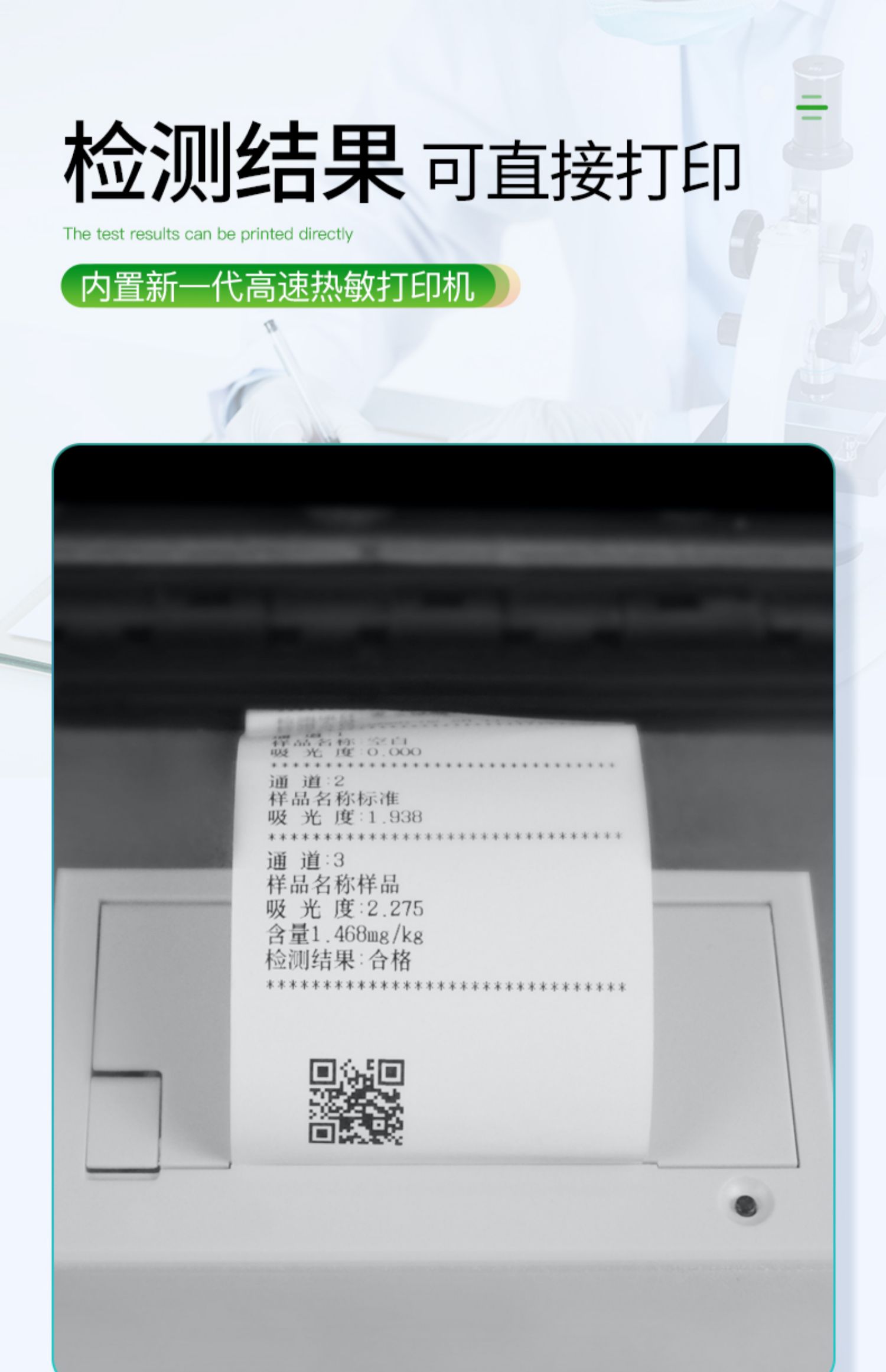13、內置新一代高速熱敏打印機(無需色帶),打印內容包含:檢測單位、檢測人員、檢測項目、通道號、吸光度、重金屬含量(mg/kg)、檢測時間、以及二維碼等信息