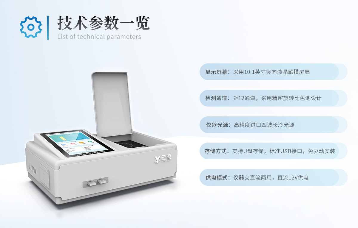 山東云唐智能科技有限公司生產的高智能食品安全檢測儀為集成化食品安全快速檢測分析設備,采用臺式一體化設計,可快速檢測200多種食品安全項目,包含非食用化學物質、濫用食品添加劑、農藥殘留、獸藥殘留、重金屬、病害肉、營養強化劑、抗生素類殘留、激素類殘留、真菌毒素類殘留、化學類殘留等項目的定性定量檢測。目前廣泛應用于市場監管局、檢測中心、衛生監督部門、農業部門、院校及各單位食堂、食品肉產品深加工企業、商超市場、司法部門、餐飲機構、養殖場、屠宰場、檢驗檢疫部門等單位。