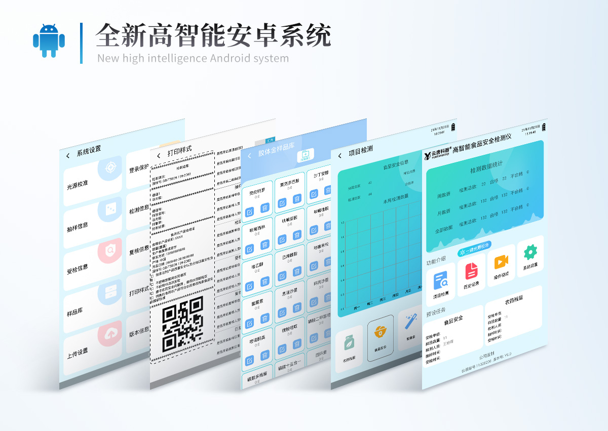| 儀器采用臺式一體化系統檢測技術,將分光光度模塊、膠體金檢測模塊、新型農殘檢測模塊、數字化管理模塊、無線通訊模塊高度集成于一體,支持檢測200種食品安全檢測項目,同時預留升級檢測方法。 | 儀器檢測模塊標準化、智能化,可隨意自由組合。檢測箱體內置多個標準檢測單元,檢測模塊可以調整配置。 | 顯示屏幕:儀器采用10.1英寸豎向液晶觸摸屏顯,搭配運行安卓智能操作系統,主控芯片采用ARM Cortex-A7,RK3288/4核處理器,主頻1.88Ghz,操作方便,性能更強。 | 檢測通道≥12通道;采用精密旋轉比色池設計,使用同芯片同光源校準精度,解決不同光源之間的誤差值。1-12通道間誤差0.1%。(***:**202022821055.2) | 儀器光源:高精度進口四波長冷光源,每個通道均配置 410、520、590、630nm 波長光源,標配**的光路切換裝置,專利光路切換功能可實現64波長,并且所有檢測項目可實現所有通道同時檢測。 | 設備可一鍵校準,自動保存校準數據,自動對比校驗,得到精準光源,采用Android SP存儲數據,光源數據永不丟失,方便每一次使用。 | 通訊接口: 配備無線通信模塊、可選配4G(APN)通訊模塊和藍牙傳輸,同時具有雙USB接口以及RJ45網線接口,可以多方式實現數據保存及數據傳輸。 | 存儲方式: 支持U盤存儲,標準USB接口,免驅動安裝。檢測結果存儲容量20萬條以上,可生成Excel表格進行拷貝,并具有登錄保護功能。 | 智能化操作系統: | 操作系統:儀器可在同一檢測界面自動對應相關檢測通道,一次性選擇1-12個樣品名稱,無需退出界面,節省操作時間。并可以對每個通道屬性和樣品信息單獨進行編輯,例如送檢單位、人員,檢測人員等,打印時勾選打印顯示。 | 數據集成系統:設備首頁自動匯總分析檢測數據,包含:周檢測數據、月檢測數據,全部檢測總數量,均包含檢測總數,合格數,不合格數,以及相關柱形分析圖,各項檢測數據一目了然,無需電腦查詢,更加快捷直觀。 | 數據庫系統:十幾項數據庫分類管理儀器:包含項目類型、項目數據、檢測數據、歷史記錄、國標信息、曲線信息、采樣信息、檢測信息、受檢信息、復核信息、圖表信息、光源校準信息、打印樣式信息、樣品庫信息等等,數據庫之間互相協調聯動保證數據的真實完整性。同時產品數據庫以及歷史檢測記錄支持一鍵檢索功能。 | 限量規判系統:具有限量查詢、添加物質合規判定系統。檢測出結果后,系統自動調用系統數據庫中相關國標進行比對判定,客觀顯示判定結果是否合格。 | 項目預設系統:儀器具有任務預設模塊,一鍵提前預設,給出方便快捷的新檢測方案,每一個任務分別可以設置不同的樣品、批次、編號、來源、備注、抽樣信息、檢測信息、受檢信息、復核信息等更多信息。樣品送檢時一鍵調取保存信息,并可多次調取,大大提高檢測效率。 | 數據監管系統:同步對接監管平臺,數據可局域網和互聯網數據上傳,檢測結果可選擇直接傳至食品安全監管平臺。進行區域食品安全監管及大數據分析處理與數據統計,檢測區域食品安全長短期動態,達到食品安全問題預估、預警。 | 打印系統:內置全新打印機,新創自定義打印方式,可按需靈活勾選控制:產品合格證(國家農業部標準要求),二維碼,抽樣信息、檢測信息,受檢信息、復核信息、抽樣日期、檢測日期等信息的打印。 | 供電模式:儀器交直流兩用,直流12V供電,可連接車載電源,可配6ah大容量充電鋰電池,電量可實時顯示,方便戶外流動測試。 | 設備尺寸:(長*寬*高)440*300*180mm | 儀器加入遠程升級功能,可定向分客戶分儀器更新,開機后自動更新,客戶無需任何操作,即可升級全新項目。做到了無需退換機器即可實現實時遠程升級檢測儀器。 |