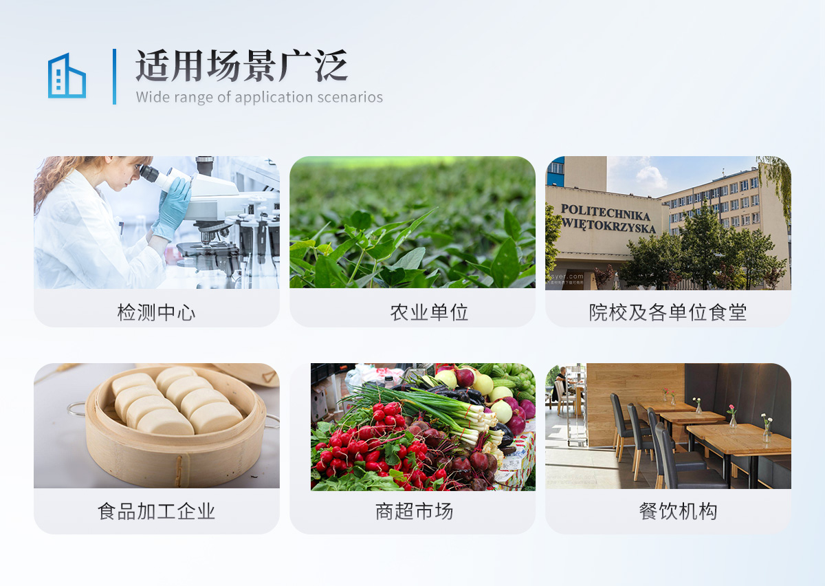 | 食品添加劑:二氧化硫、雙氧水、亞硝酸鹽、硝酸鹽、苯甲酸鈉、山梨酸鉀、糖精鈉、甜蜜素、木耳硫酸鎂等 | 有毒有害物質:甲醛、吊白塊、硼砂、過氧化苯甲酰、溴酸鉀、羅丹明B、三聚氰胺、蘇丹紅、工業堿、尿素、明礬等 | 果蔬:農藥殘留(酶抑制率法) | 病害肉:組胺、揮發性鹽基氮 | 重金屬含量:鉛、鎘、鉻、汞、砷、錫、鎳、鋁等 | 水酒飲品分析:酒中甲醇、乙醇、乳品及牛奶中蛋白質 | 調味品成分: 食醋的總酸、醬油的總酸、芝麻油純度、谷氨酸鈉、醬油氨基酸態氮、食鹽中亞鐵氰化鉀、食鹽中碘等 | 蜂蜜成分:果糖和葡萄糖、蔗糖、淀粉酶、酸度等 | 食用油脂:過氧化值、酸價等 |
