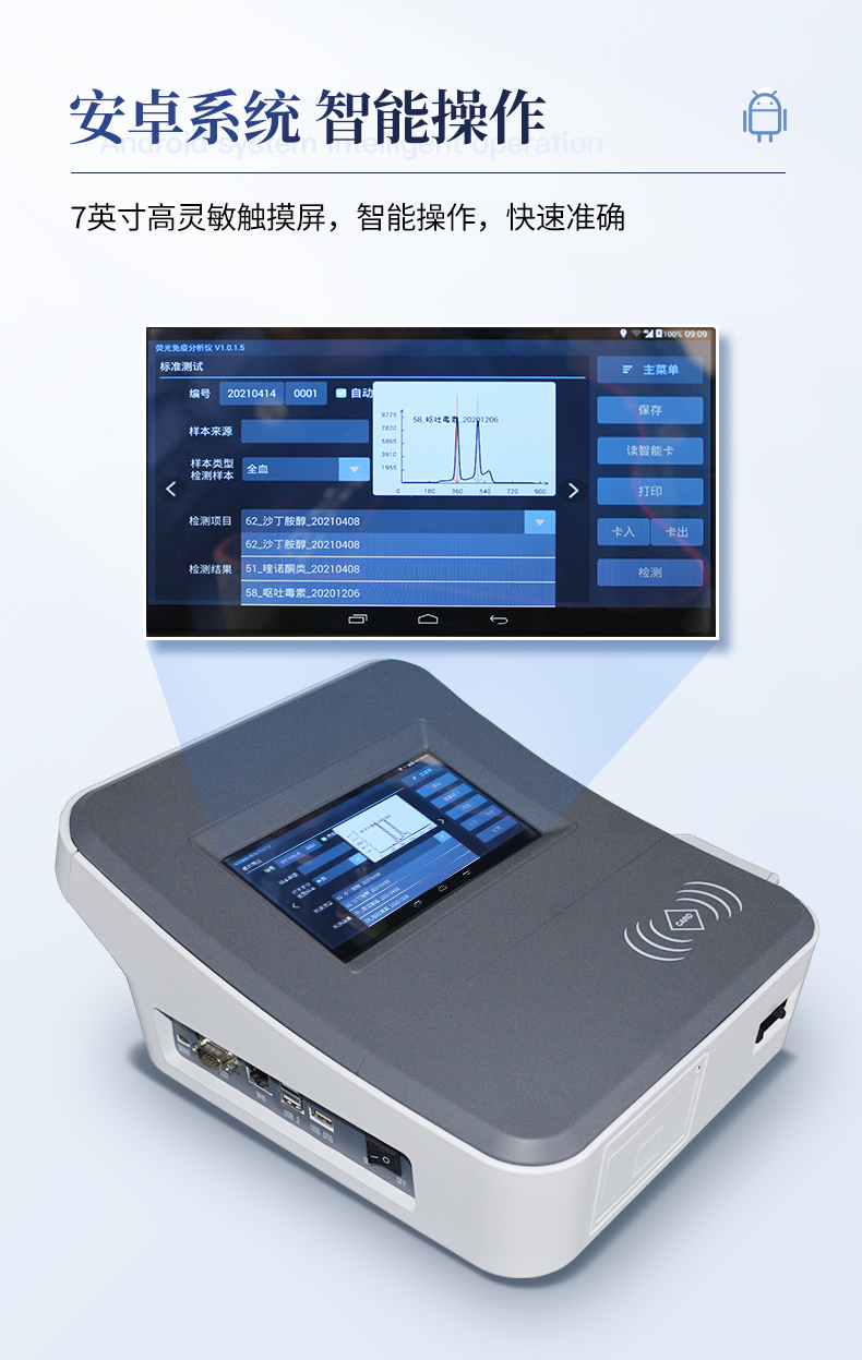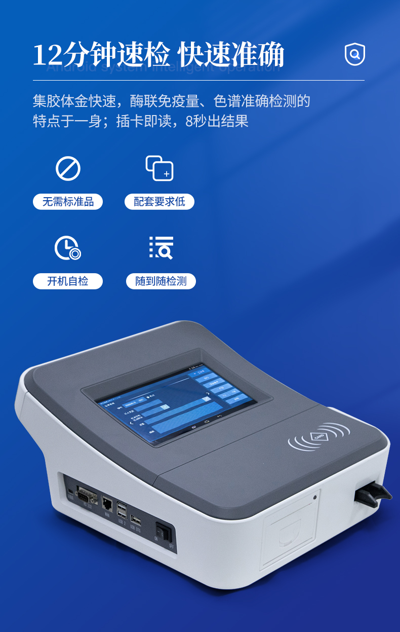 | 1、儀器自動識別檢測卡條形碼上的檢測項目、樣本類型、檢測限、標準曲線,形成完整的檢測數據信息鏈。一卡一控,插卡后儀器自動讀取檢測卡顯示的C、T線的熒光信號,依據檢測卡內置的標準曲線,自動計算結果;用戶可根據自身需求,選擇設定檢測限/定量限(內控或國家標準限量)。 | 2、檢測數據信息采集項目(包括但不限于):儀器至少支持以下檢測數據采集:①檢測項目;②樣本類型;③檢測樣本;④國家限量;⑤檢測者;⑥檢測單位;⑦檢測時間;⑧檢測線/定量限;⑨檢測編號;⑩內控限量 樣本來源等,并支持數據采集項目遠程擴展升級。 | 3、檢測數據采集方式:檢測數據信息采集項目中載明的:①-⑨項為儀器自動識別采集,⑩項為手寫輸入。 | 4、檢測數據上傳方式:完成檢測后,儀器能自動將檢測數據信息采集項目載明的全部檢測數據信息上傳至檢測監管系統平臺。 | 5、接口:藍牙通訊接口;內置無線WIFI,檢測數據實時傳輸到數據監管平臺,客戶可通過賬號登陸在網絡上實時查看檢測數據 | 6、存儲空間:存儲空間16GB。 | 7、信息輸入:支持中英文手寫輸入。 | 8、本機數據管理:具有檢測數據存儲、查詢,批量數據刪除和打印等功能。 | 9、檢測項目管理:儀器支持檢測項目及對應國家限量遠程增加、刪除等維護管理。 | 10、操作權限管理:儀器支持檢測操作人員使用賬號、密碼登陸儀器的功能,支持賬號、密碼在監管系統平臺進行驗證。 | 11、在線學習:內置檢測項目操作流程簡圖,教學軟件可實時在線更新。 | 12、工作溫度:5-40℃,相對濕度:10%-90%。電源電壓220V±22V,頻率50Hz±1Hz,額定功率40W,與電源的連接方式:可拆卸電源線。 | 13、恒溫孵育器 | (1)適用于定量膠體金試紙卡和反應液體準確控溫反應,以提高準確性; | (2)孵育器卡槽數6個,每個卡槽時間獨立控制; | (3)插入卡條后自動倒計時,倒計時結束自動報警,并記錄超時時間; | (4)內部恒溫控制,控溫溫度:37℃,控溫精度≤0.5℃,升溫速度≤8min,溫度均勻性≤0.3℃,實時溫度顯示精度:0.1℃。 |