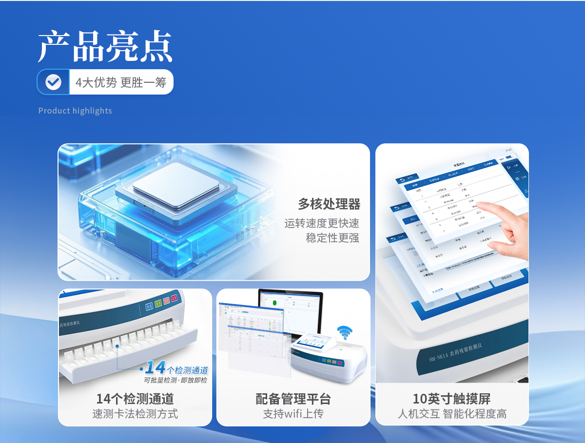 | 1、★采用速測卡法,省卻冗雜的步驟,提高檢測體驗和效率 | 2、安卓智能系統7.1版本,操作更加流暢,使用更方便。 | 3、★10英寸高靈敏真彩觸摸屏顯示,交互性用戶體驗更好。 | 4、★具有14個檢測卡通道,可更多的批量測試樣品,即放即檢,檢測效率更高。 | 5、支持wifi、藍牙傳輸,數據可無線上傳;支持U盤拷貝數據,免驅動插拔。 | 6、配置食品安全管理平臺,檢測結果可長期存儲,進行長短期查看分析,輔助管理。 | 7、儀器具有分類管理蔬菜名稱菜單庫,并可按需編輯蔬菜名稱、檢測單位等信息。 | 8、內置熱敏打印機,可選擇性打印詳細的檢測信息。 | 9、★檢測過程中檢測倉自動彈出,自動關閉。 | 10、主控采用多核處理器,主頻1.88Ghz,運轉速度更快速,穩定性更強。 |